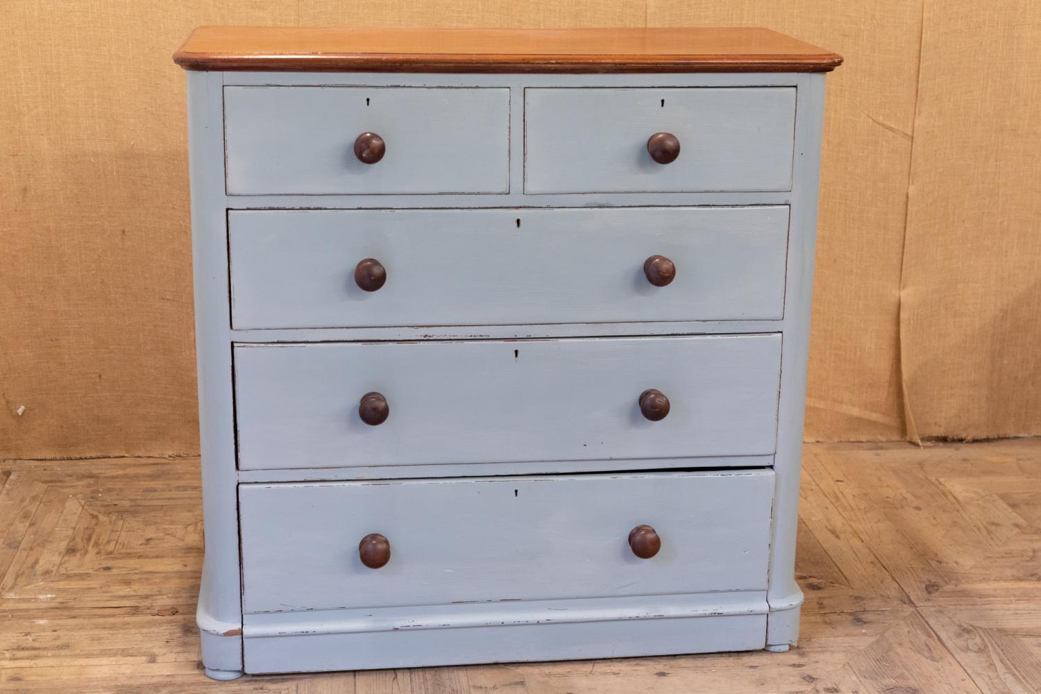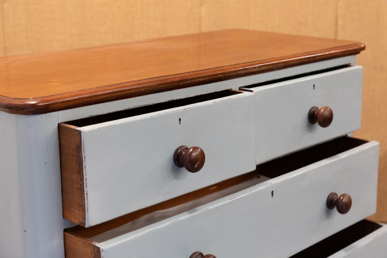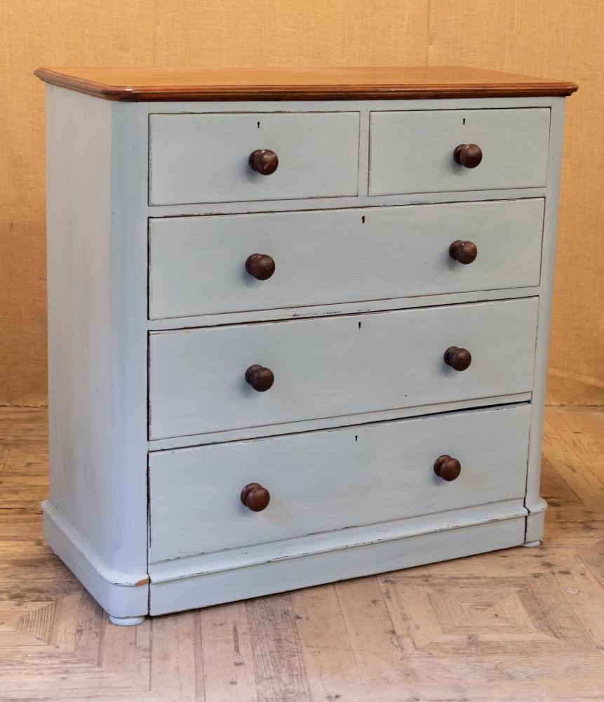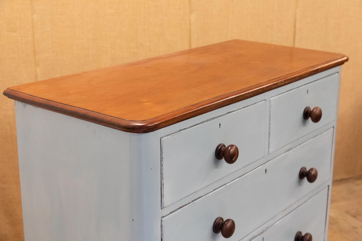 A blue painted chest of drawers with polished mahogany top. Comprising two short over three long drawers, retiring the original mahogany knobs.