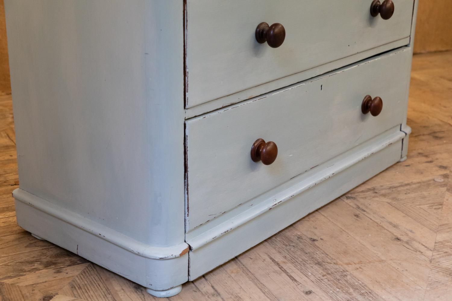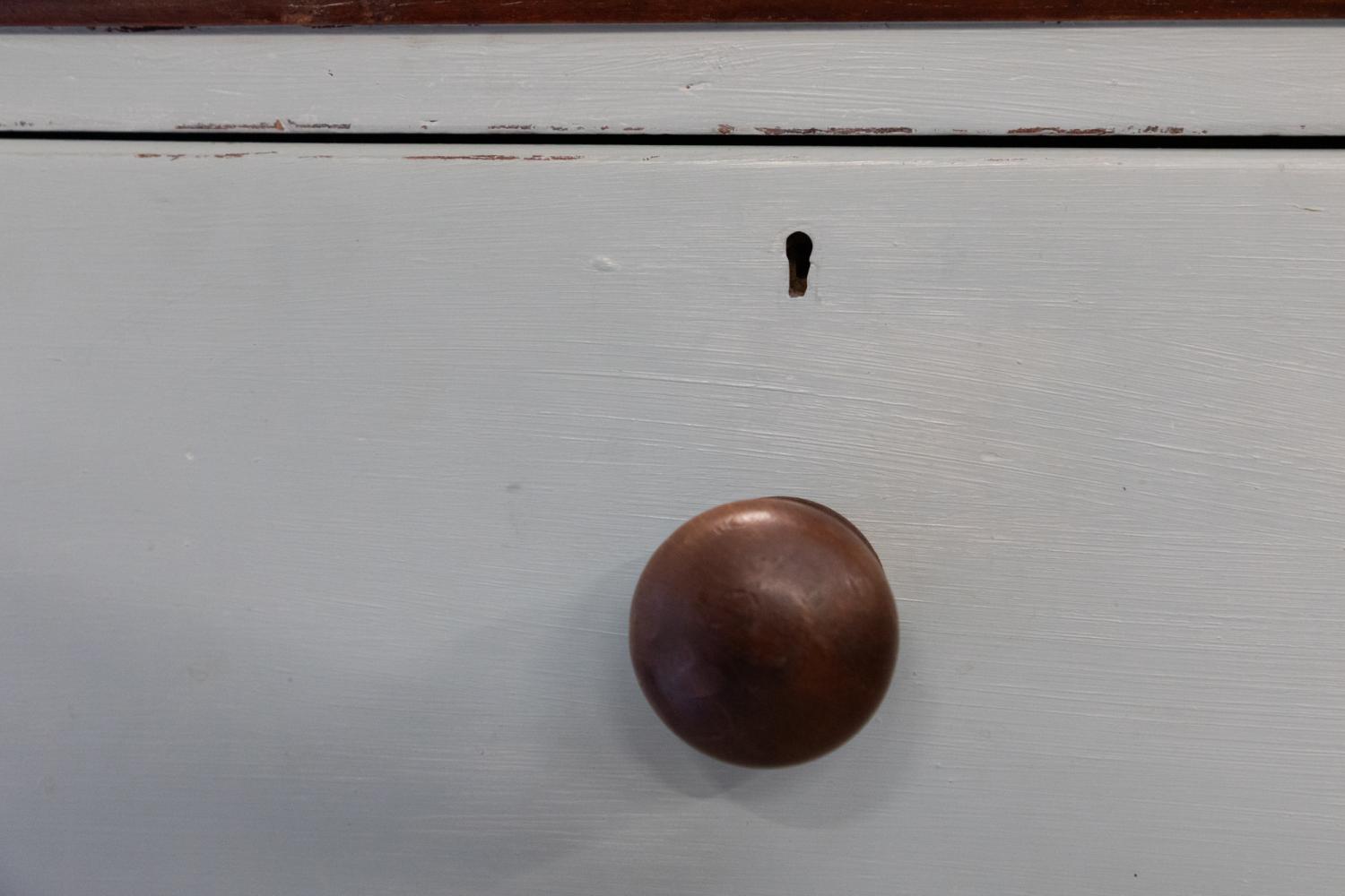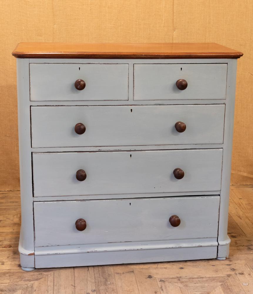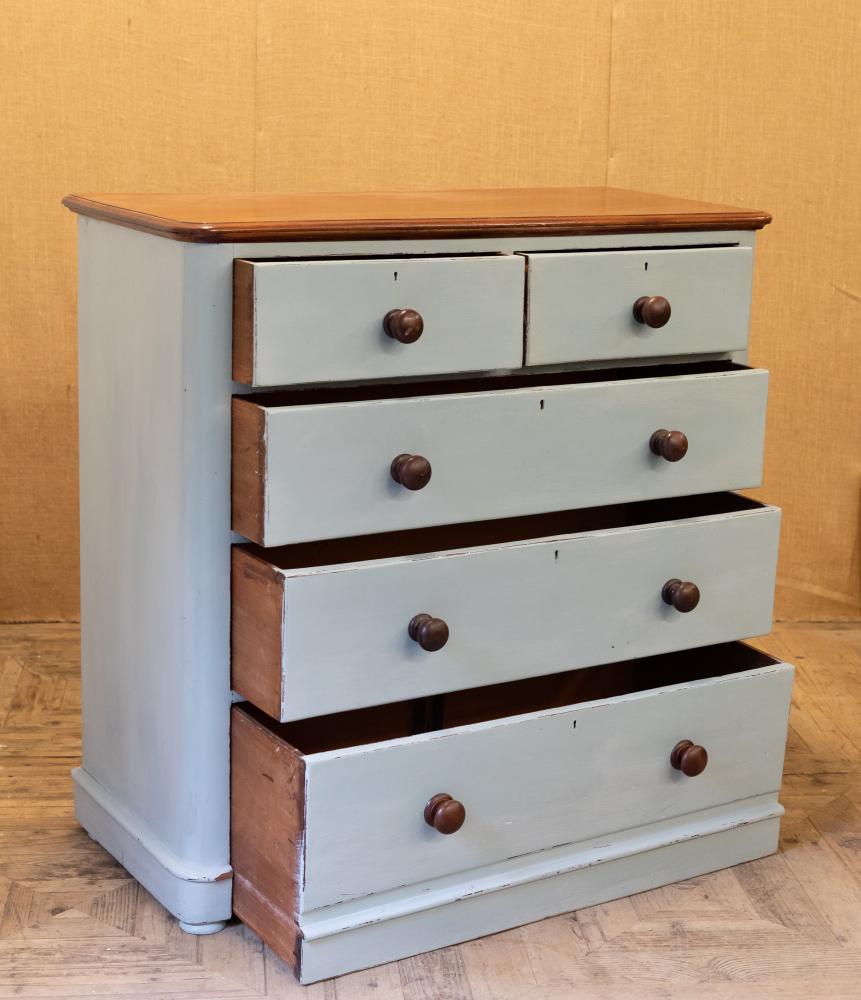 A blue painted chest of drawers with polished mahogany top. Comprising two short over three long drawers, retiring the original mahogany knobs.