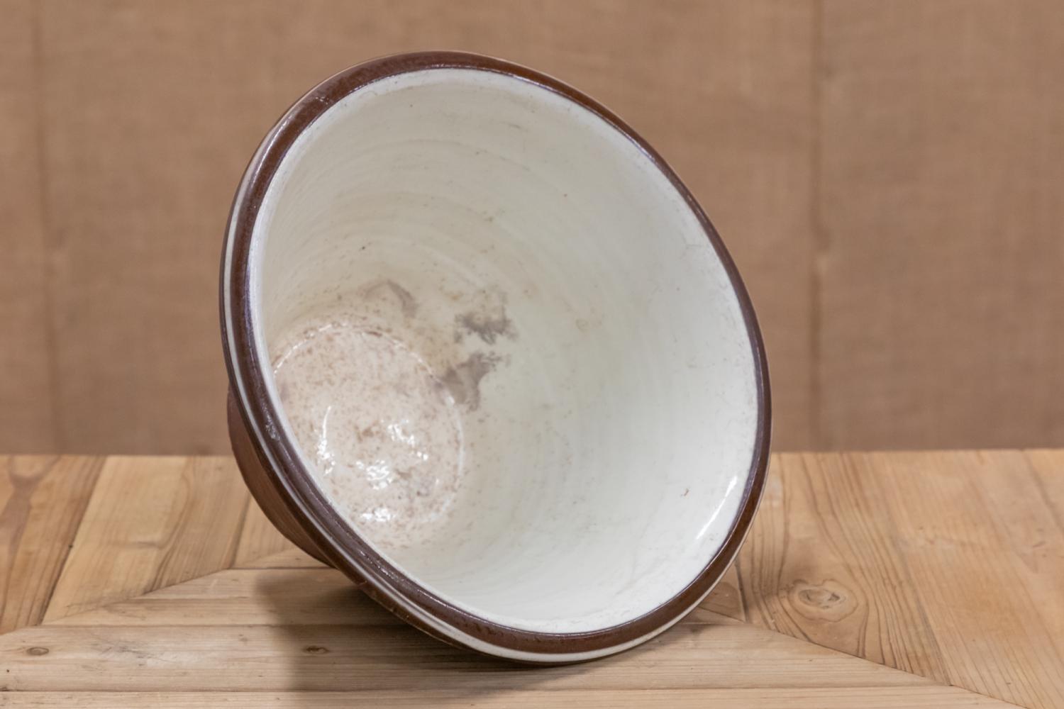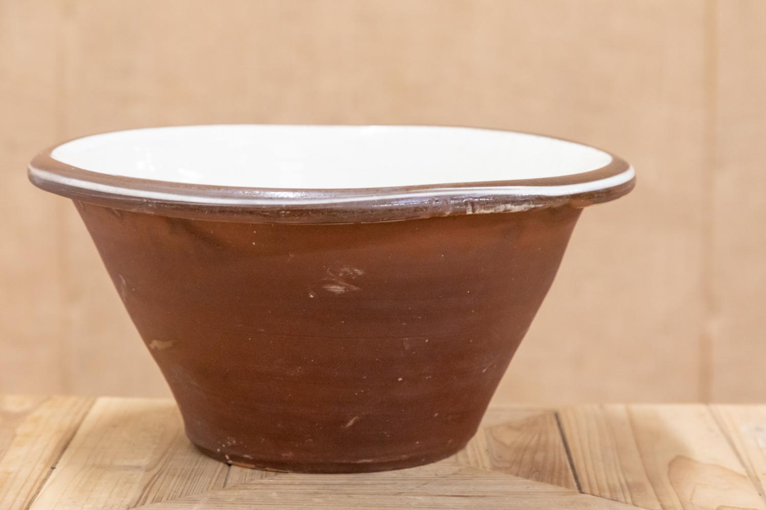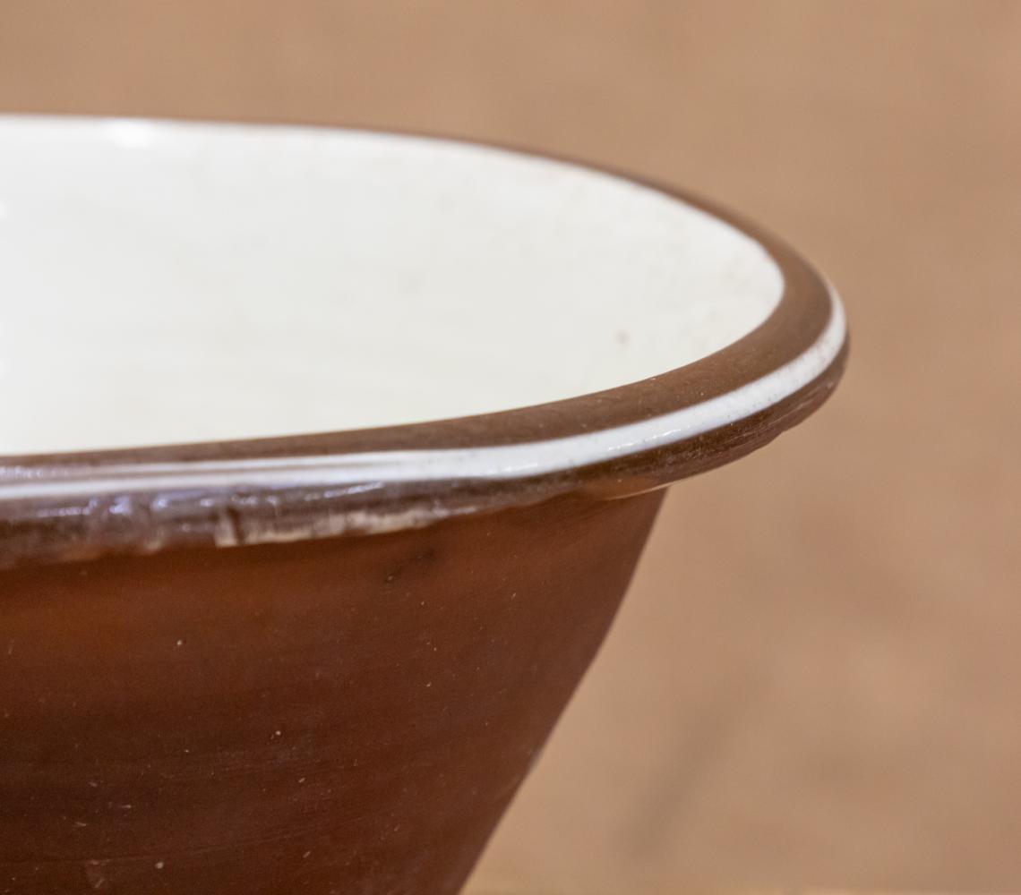 A lovely cream glazed red terracotta dairy bowl or pancheon.