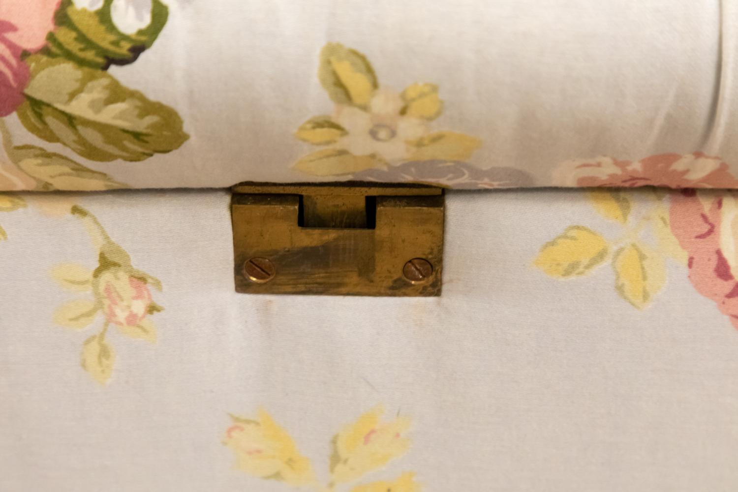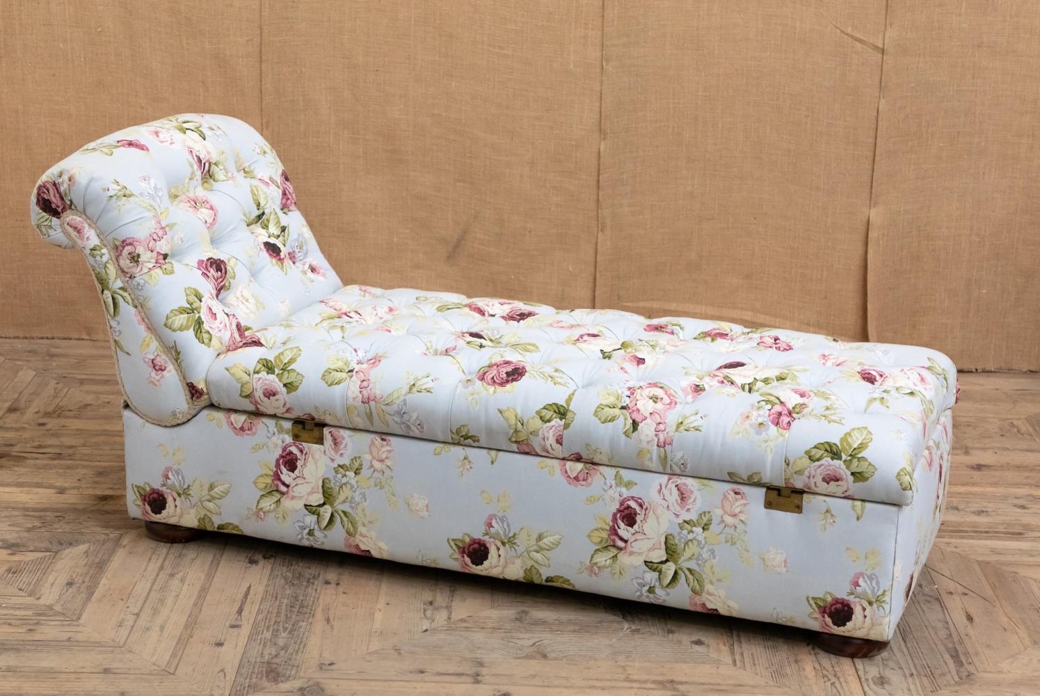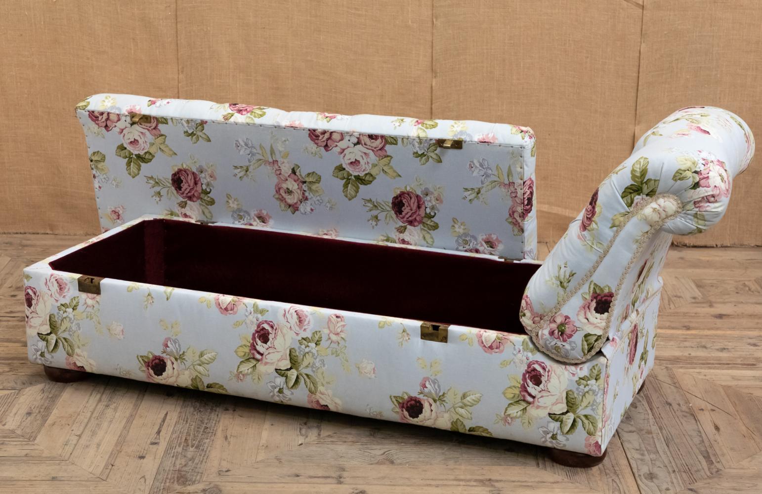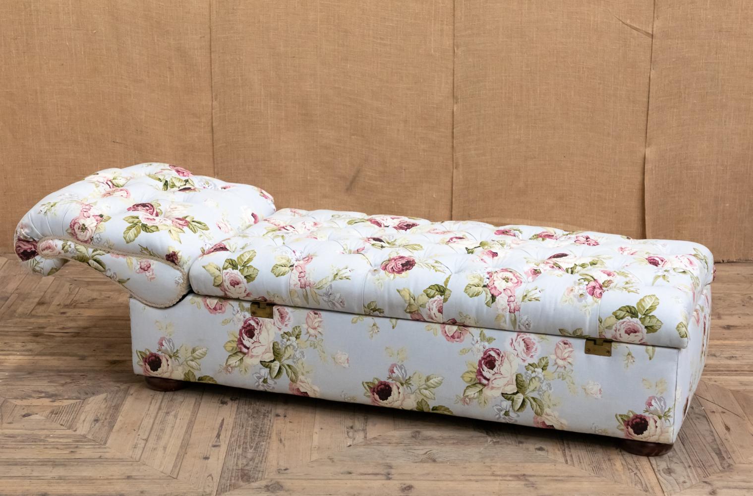 A beautiful 19th century drop arm day bed, upholstered in a stunning chintz fabric. The base with a removable lid giving storage space inside.