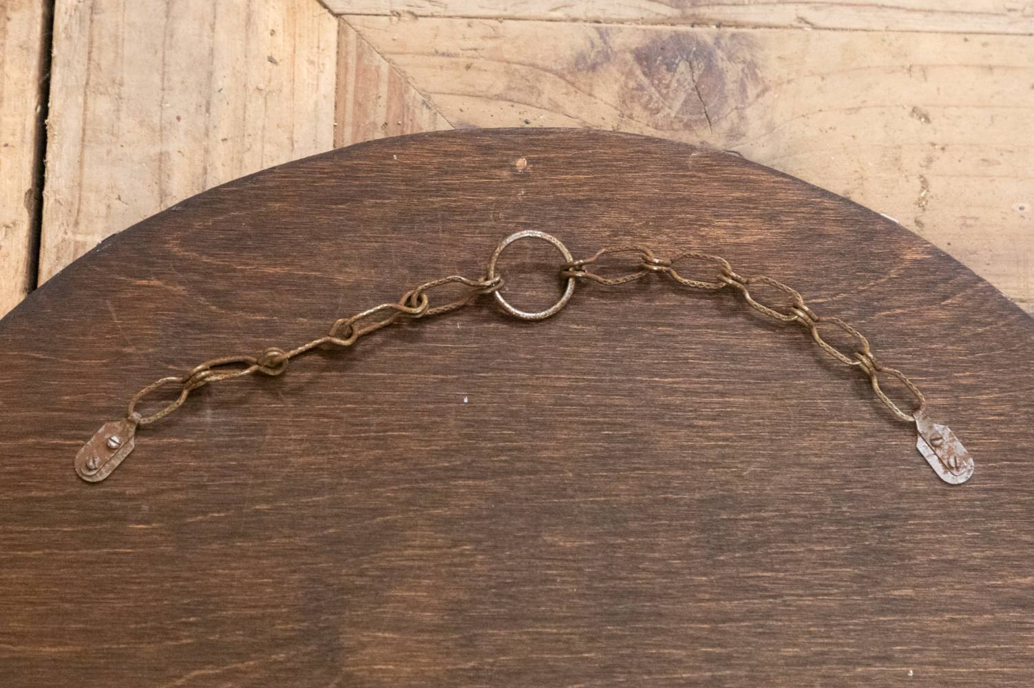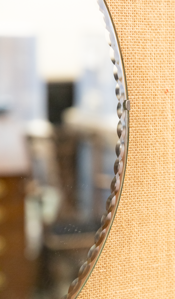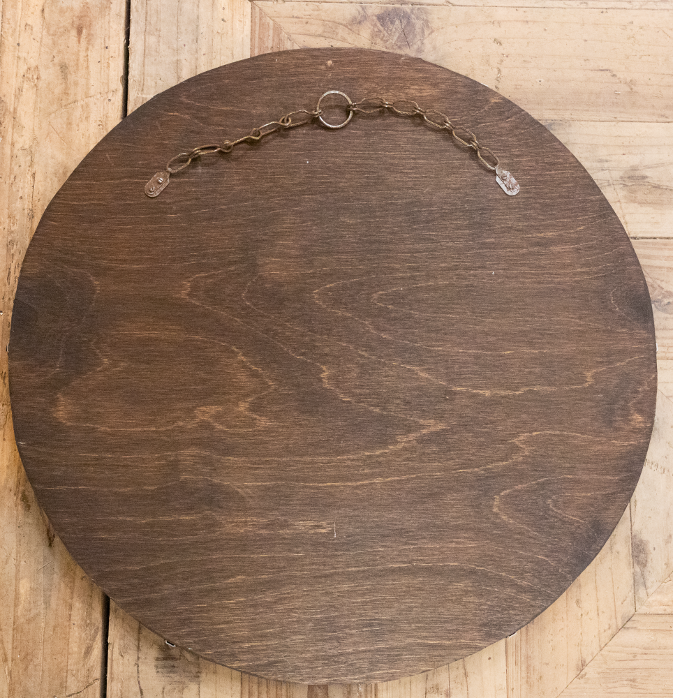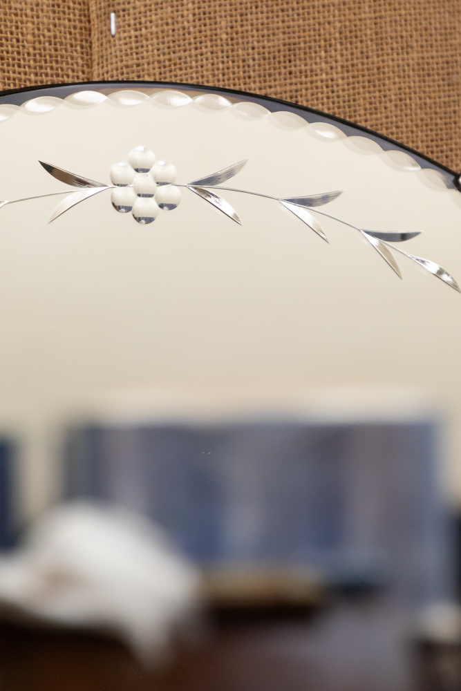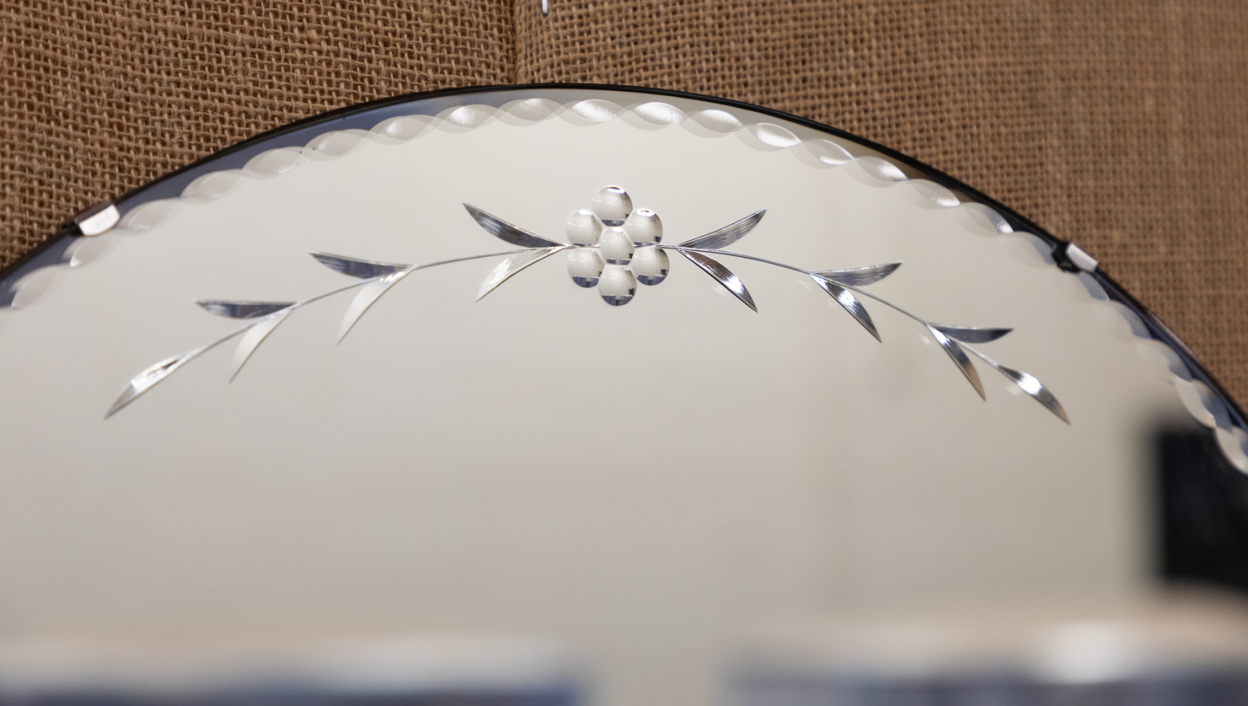 A lovely circular 1930s wall mirror. With bevelled edge and etched detail to the border. Some minor foxing to the edges of the glass, please see images.