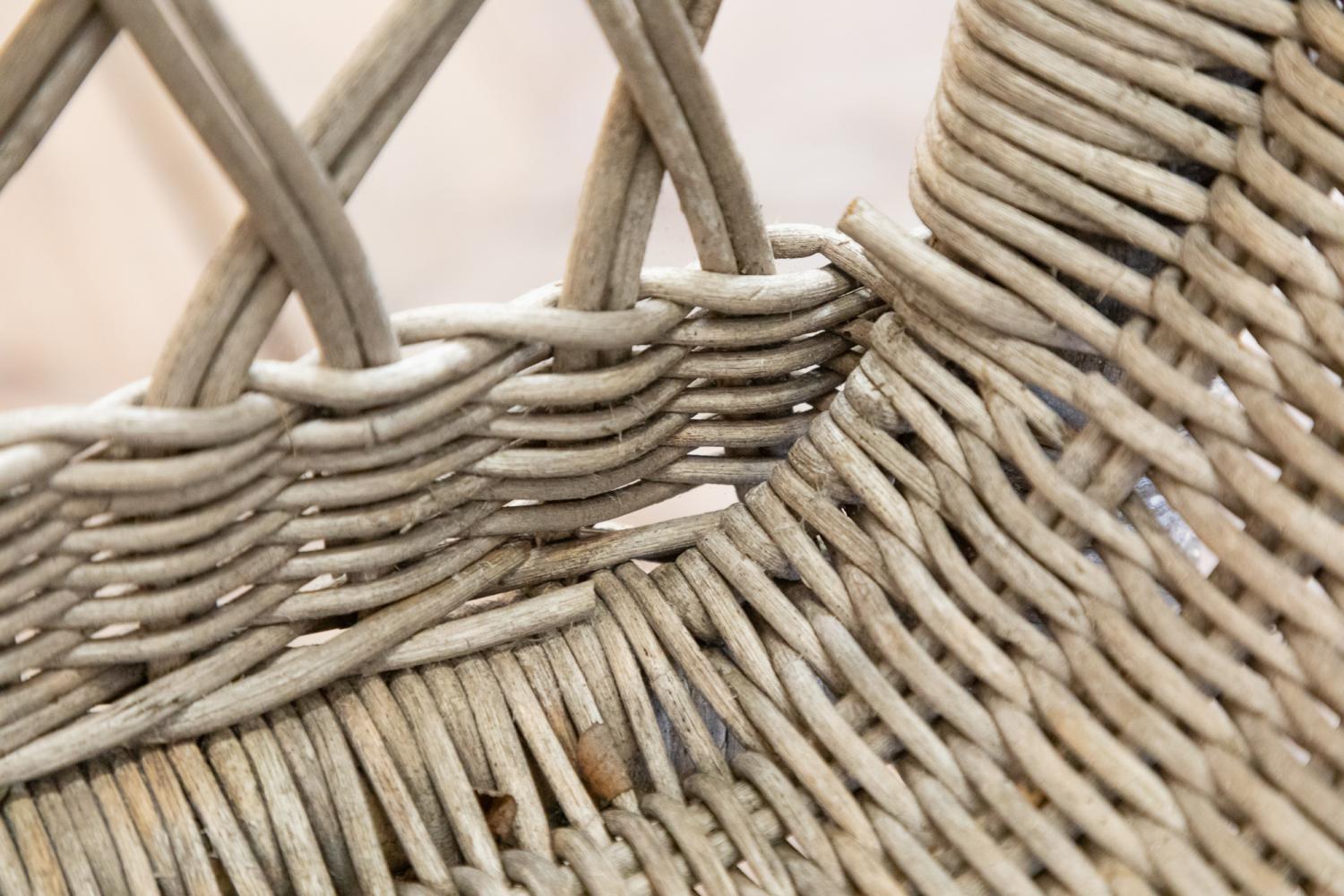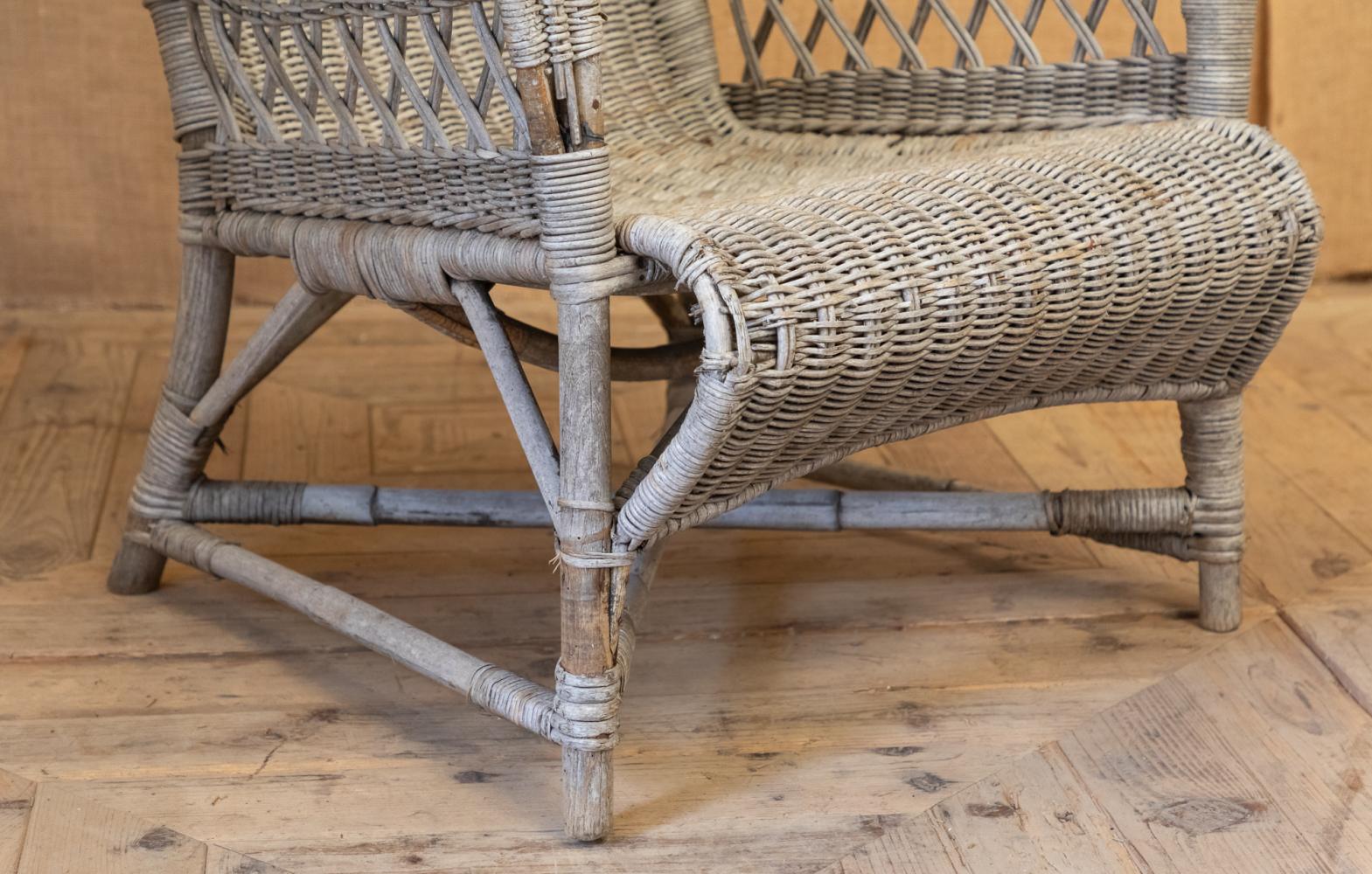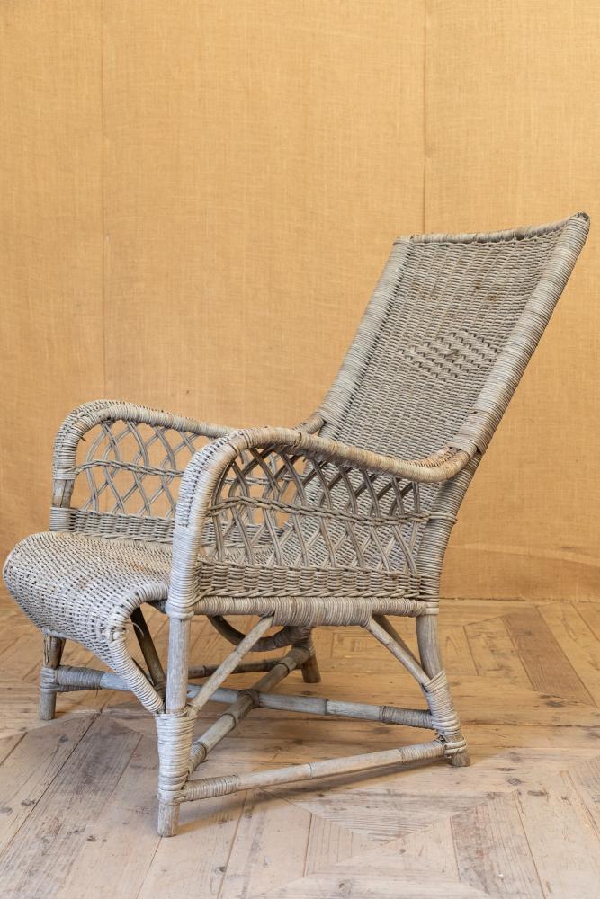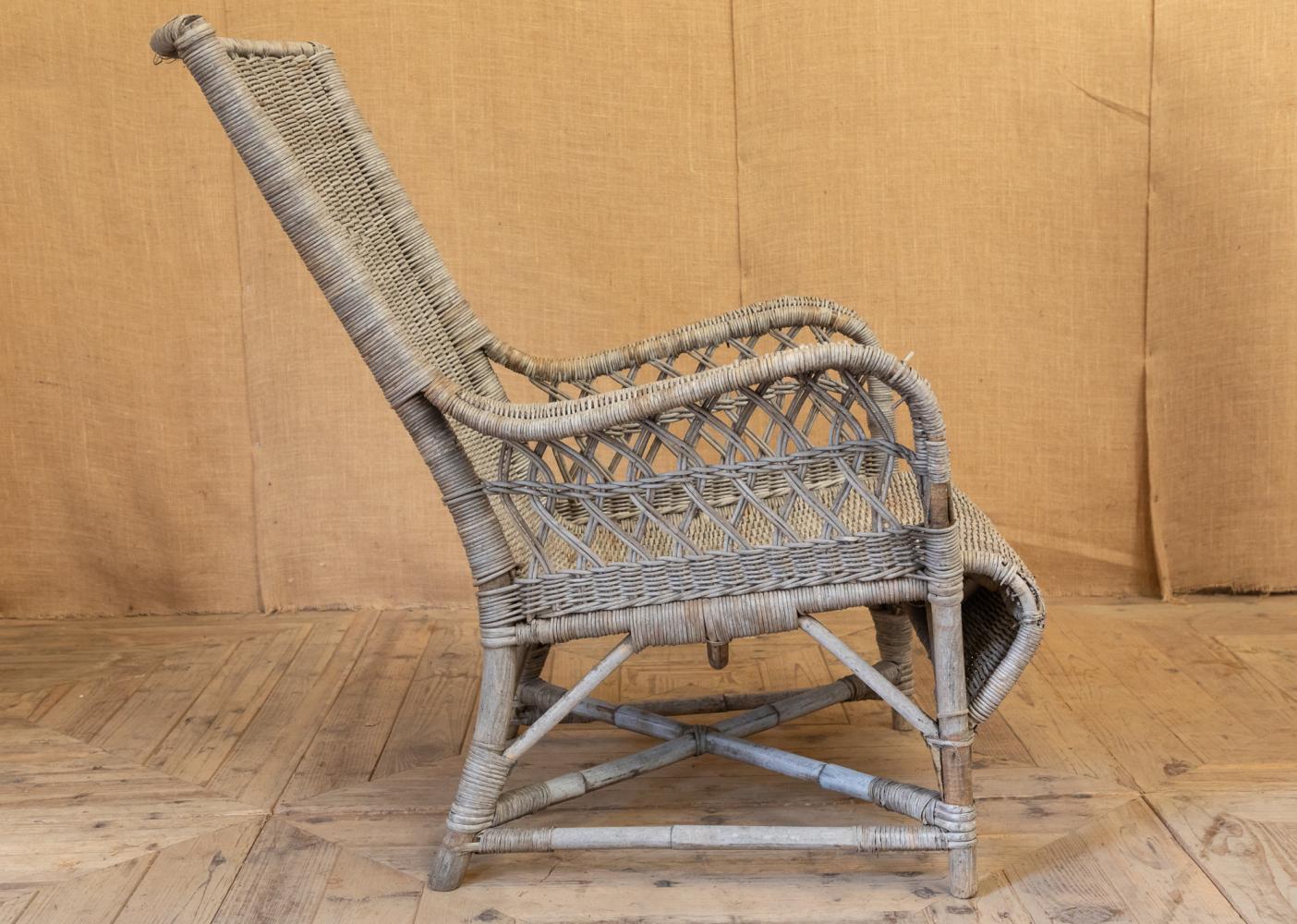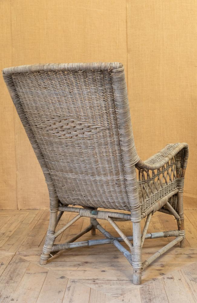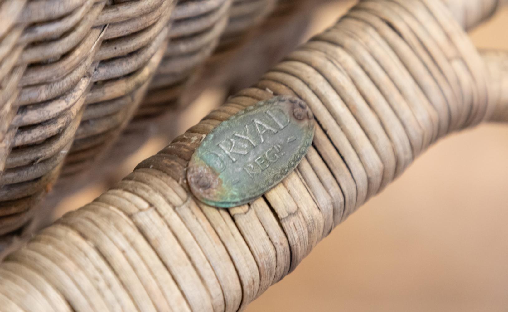 A large and comfortable, English armchair by Dryad of Leicester, known as the Sleepy Hollow model in the original catalogue. This Dryad garden armchair features a diamond pattern woven into the back rest and with an open work design under the arms. Complete with the original oval metal Dryad makers label and a wonderful weathered colour and patina.