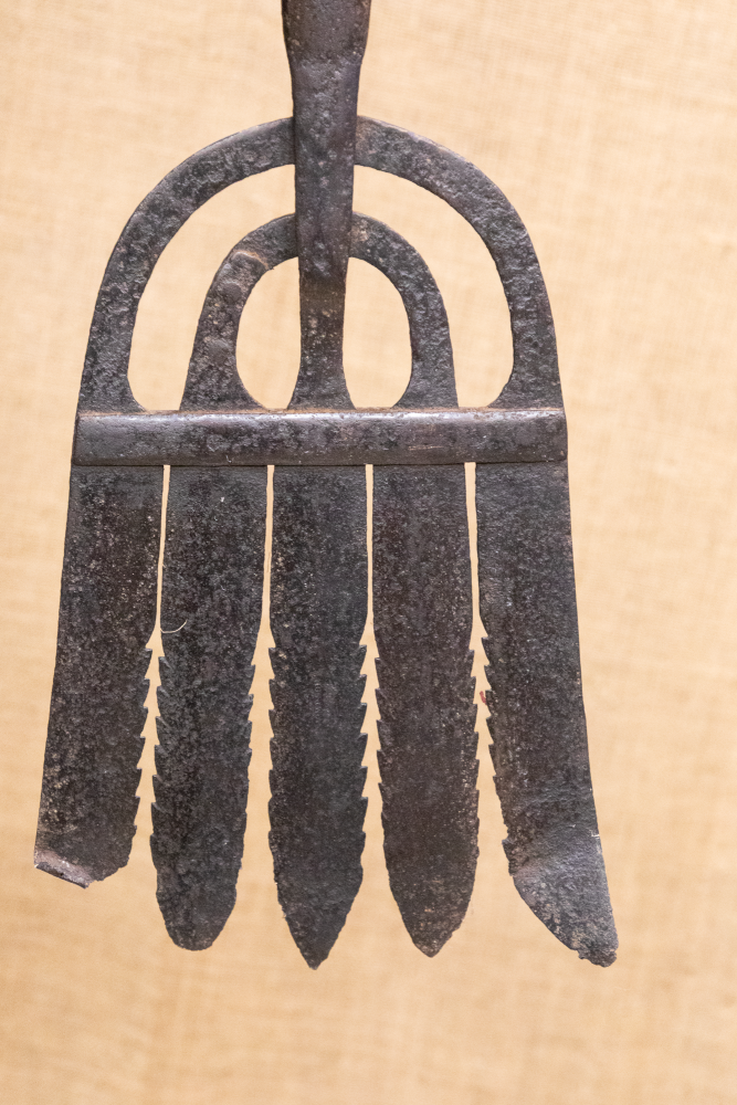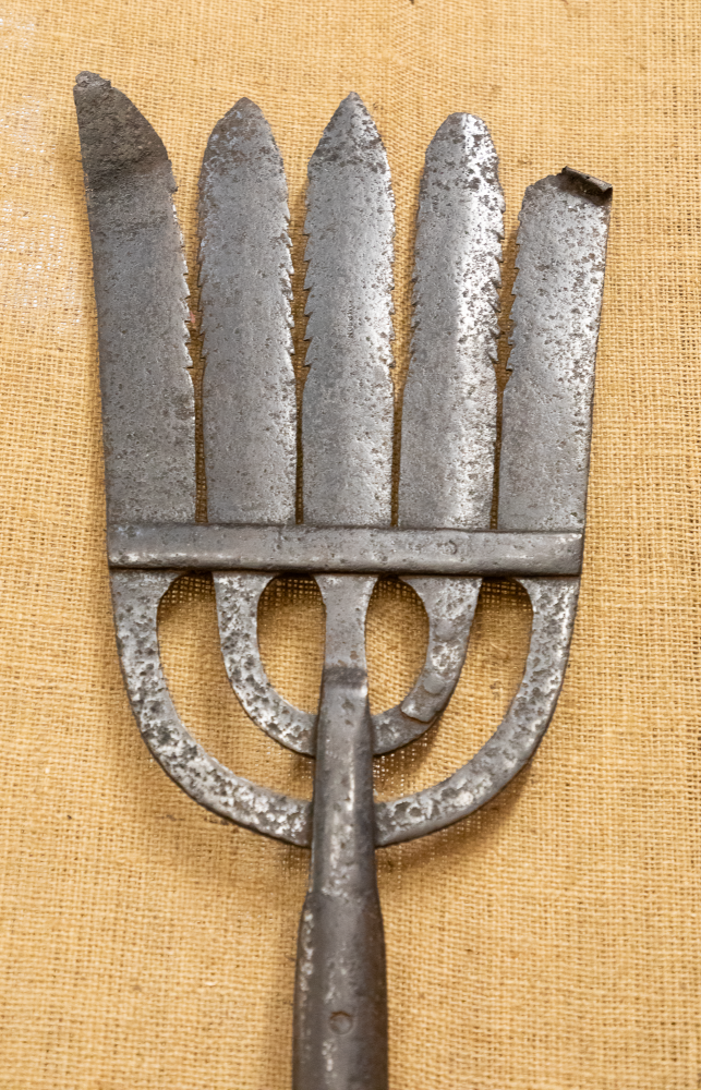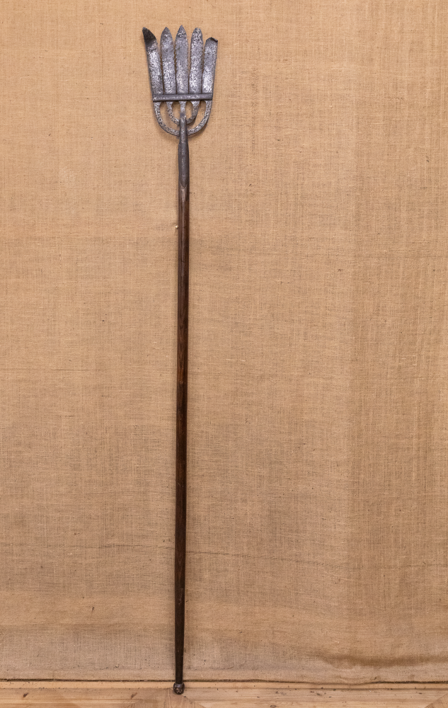 A wonderful early 19th century steel eel fork with the original shaft. Some slight damage to one tine, see image but in overall very good condition. The fork baring the name T Thompson.