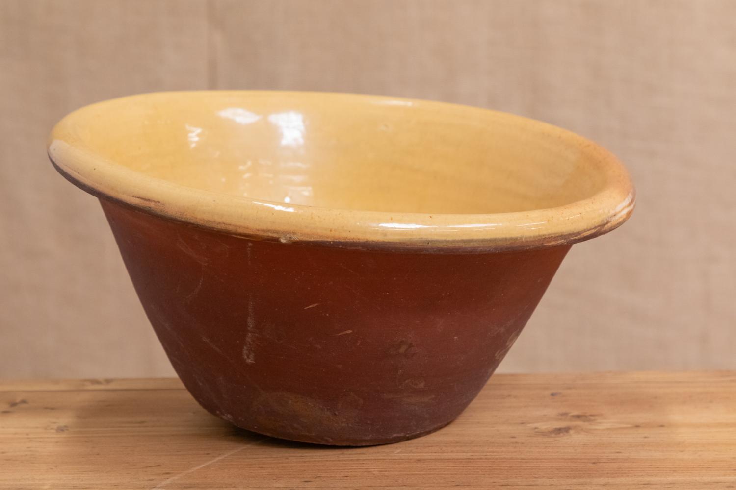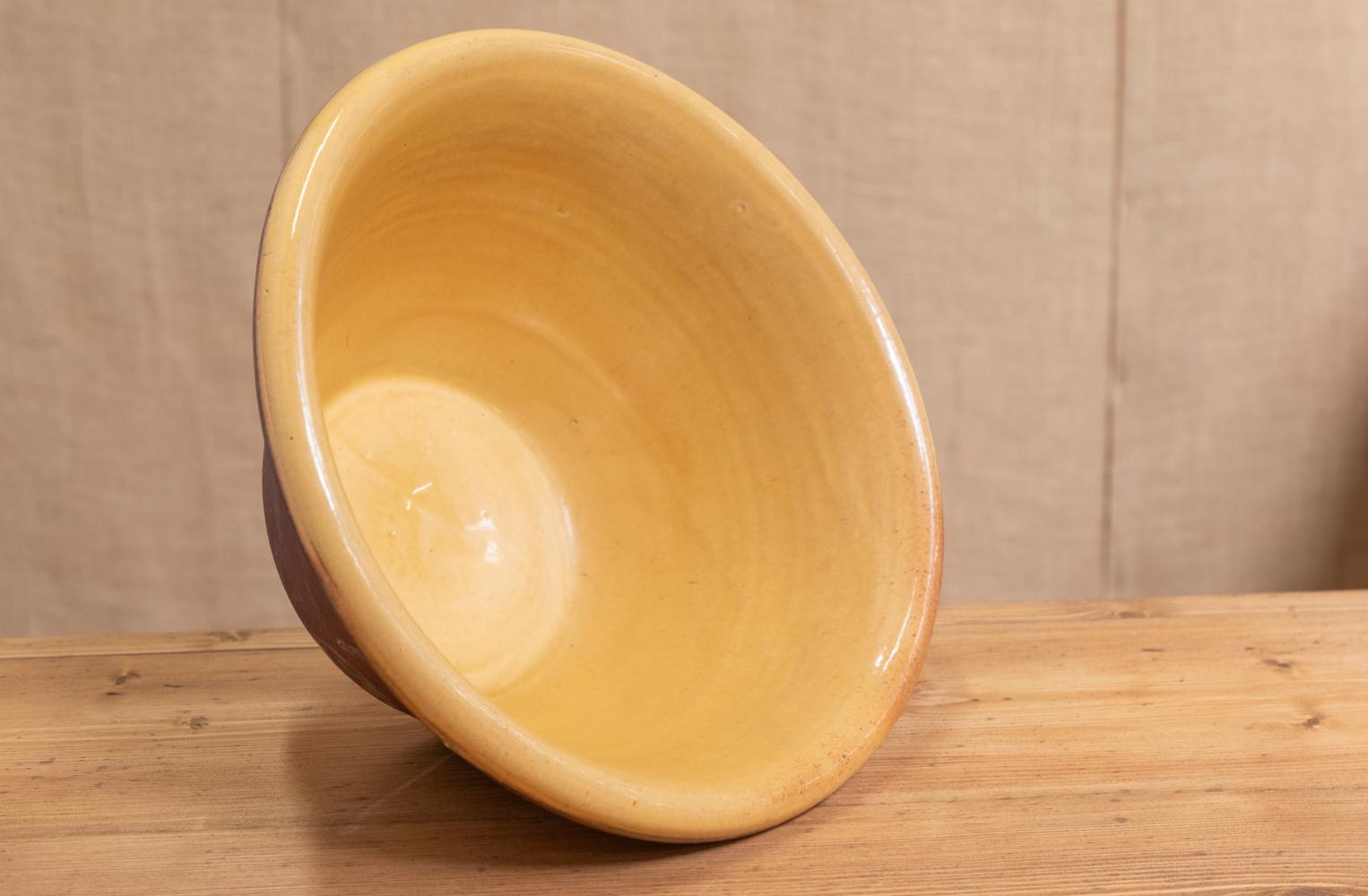 A very large 19th century glazed dairy bowl with a wonderful yellow glaze to the interior and a raw unglazed exterior.