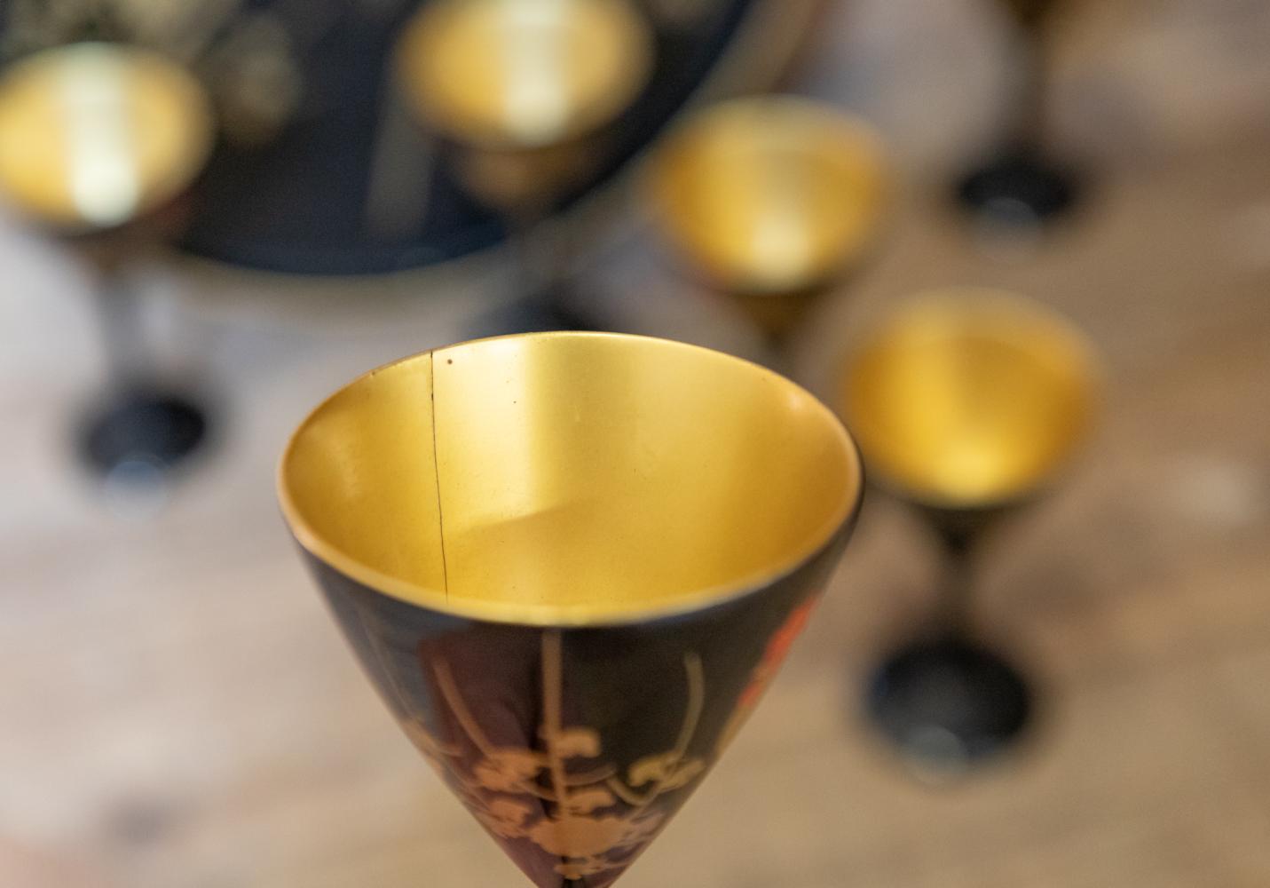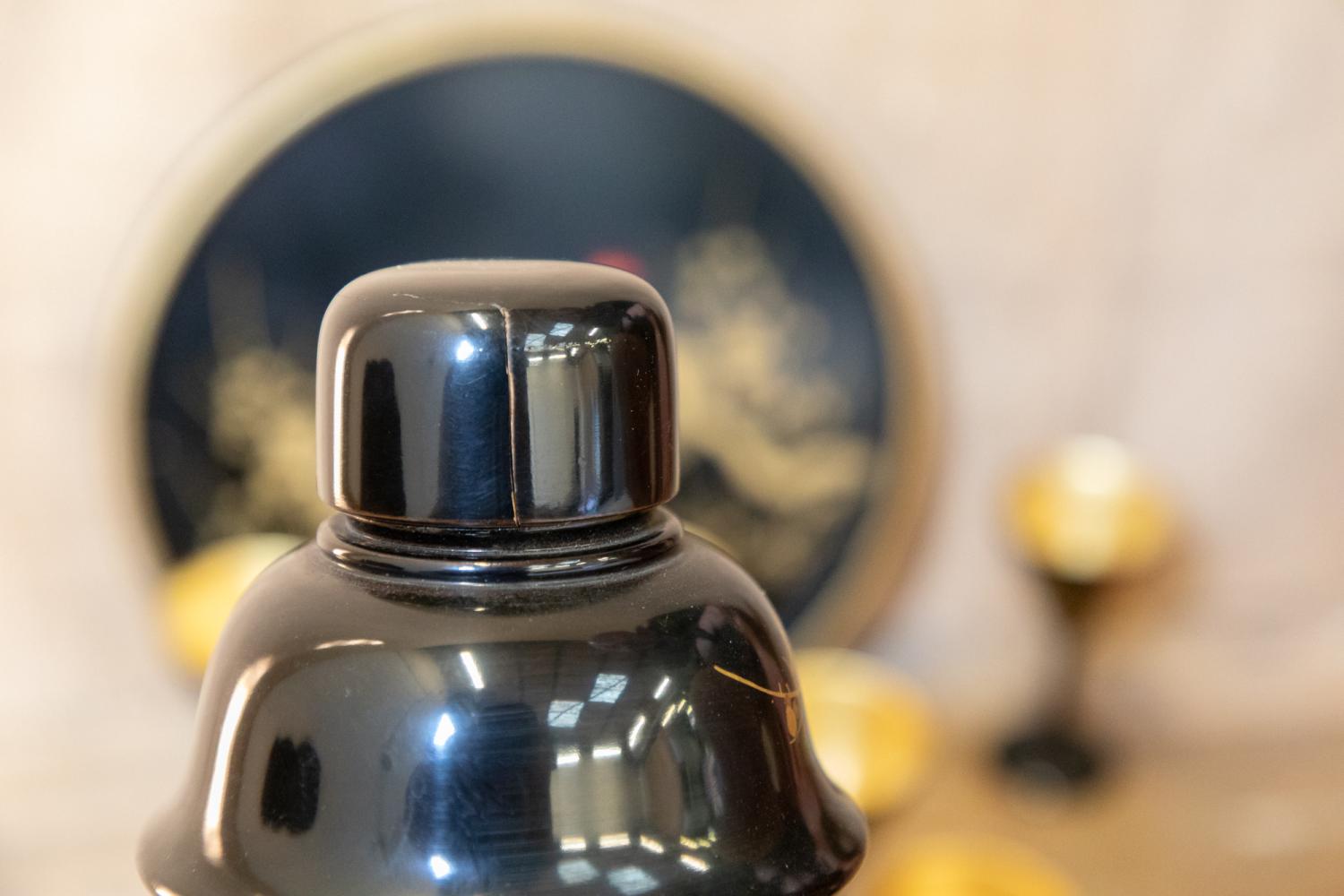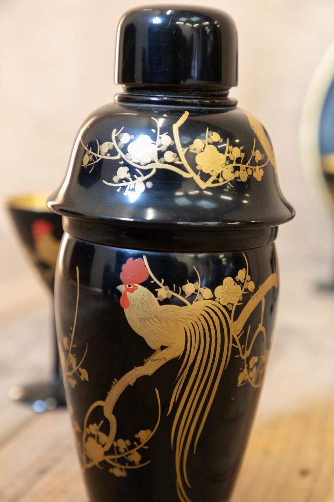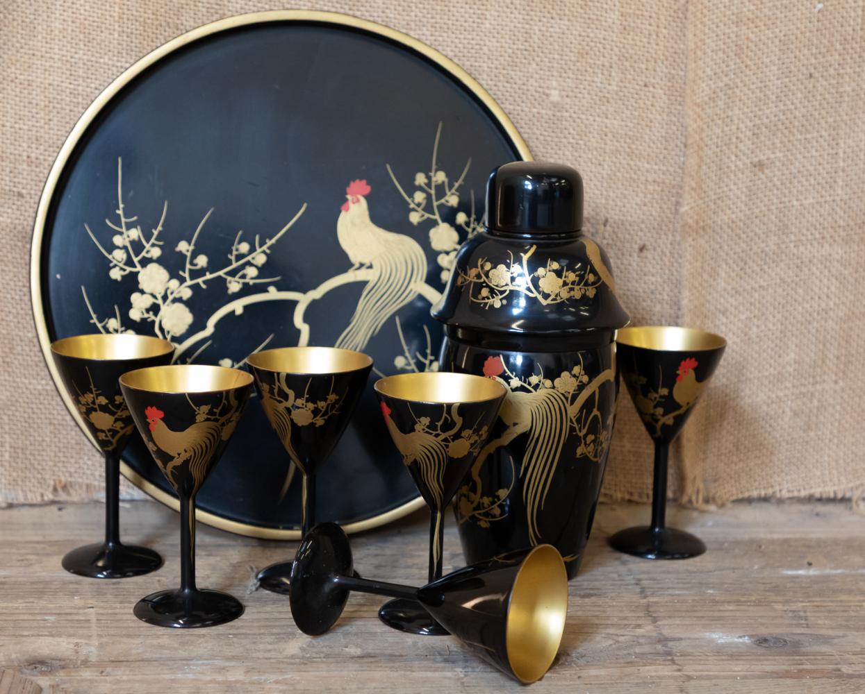 A wonderful 1920s Japanese Art Deco cocktail set comprising of cocktail shaker, tray and six martini glasses all in lacquered wood and beautifully decorated. All in perfect condition other than a small crack to the lid on the shaker.