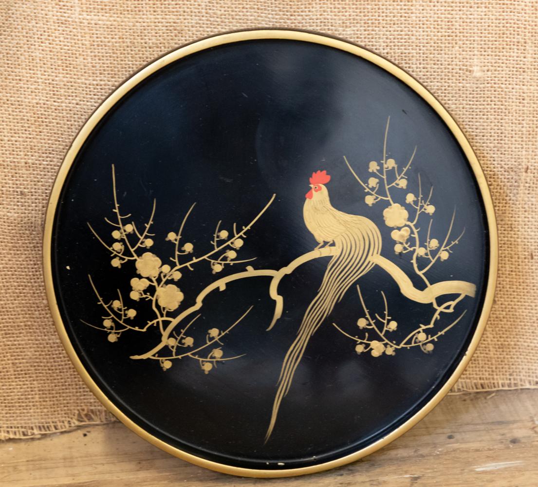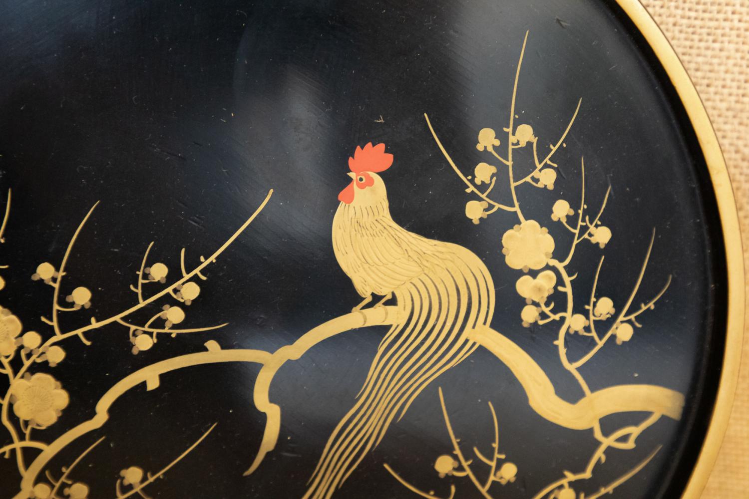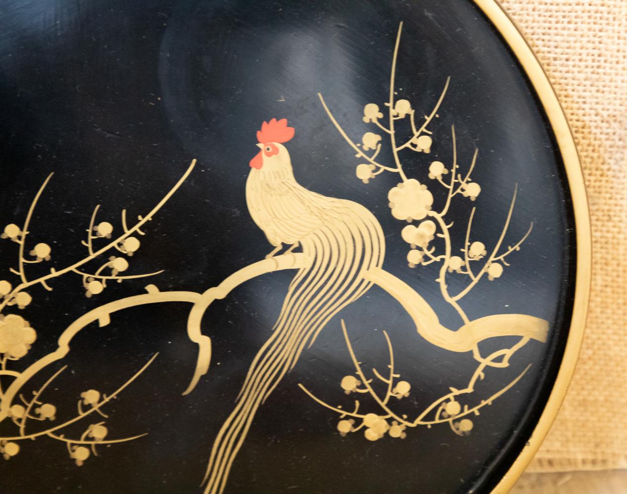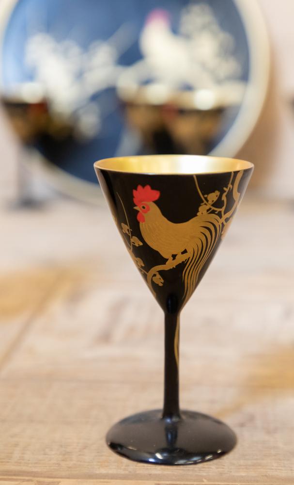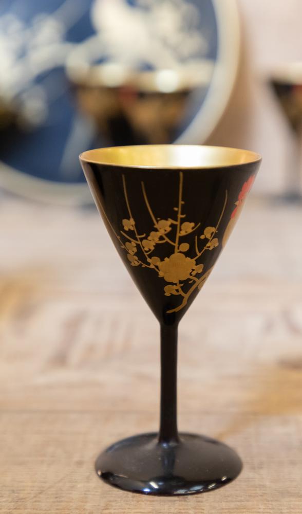 A wonderful 1920s Japanese Art Deco cocktail set comprising of cocktail shaker, tray and six martini glasses all in lacquered wood and beautifully decorated. All in perfect condition other than a small crack to the lid on the shaker.