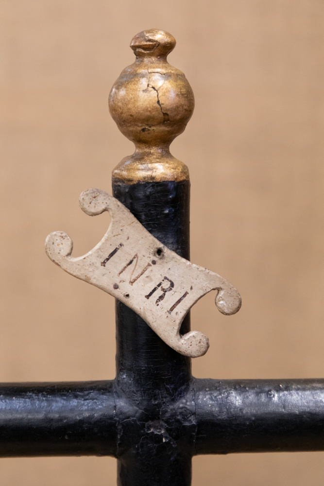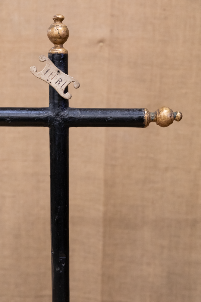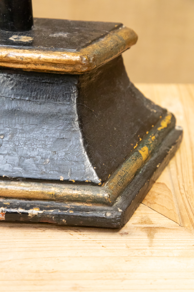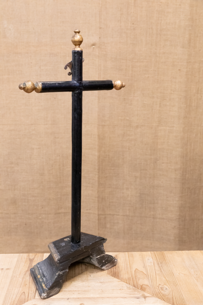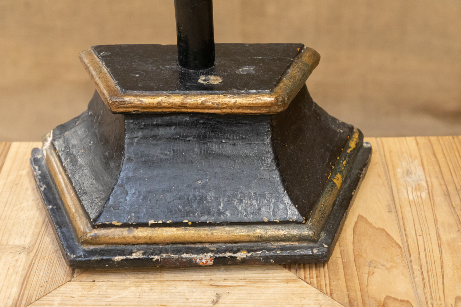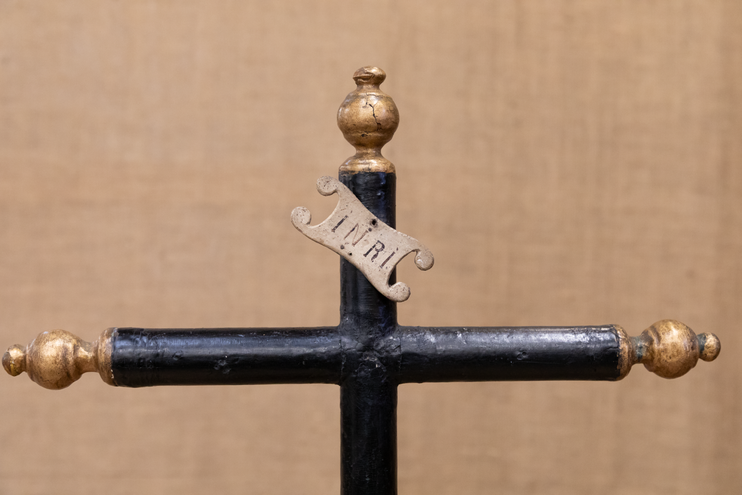 A fantastic late 18th century carved wood and gesso crucifix in the original black paint and gilding decoration. With a wonderful shaped stepped base and turned finials.