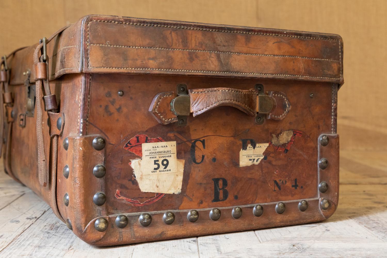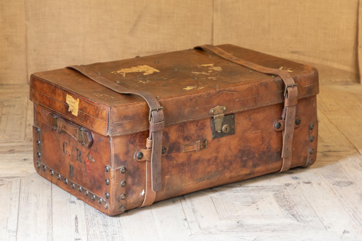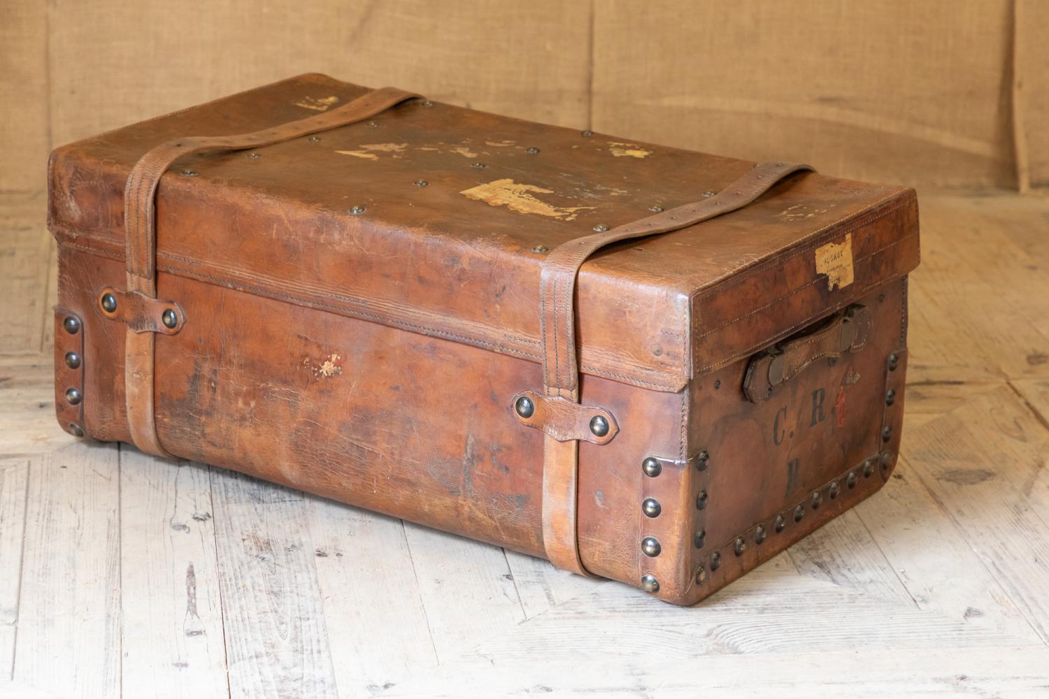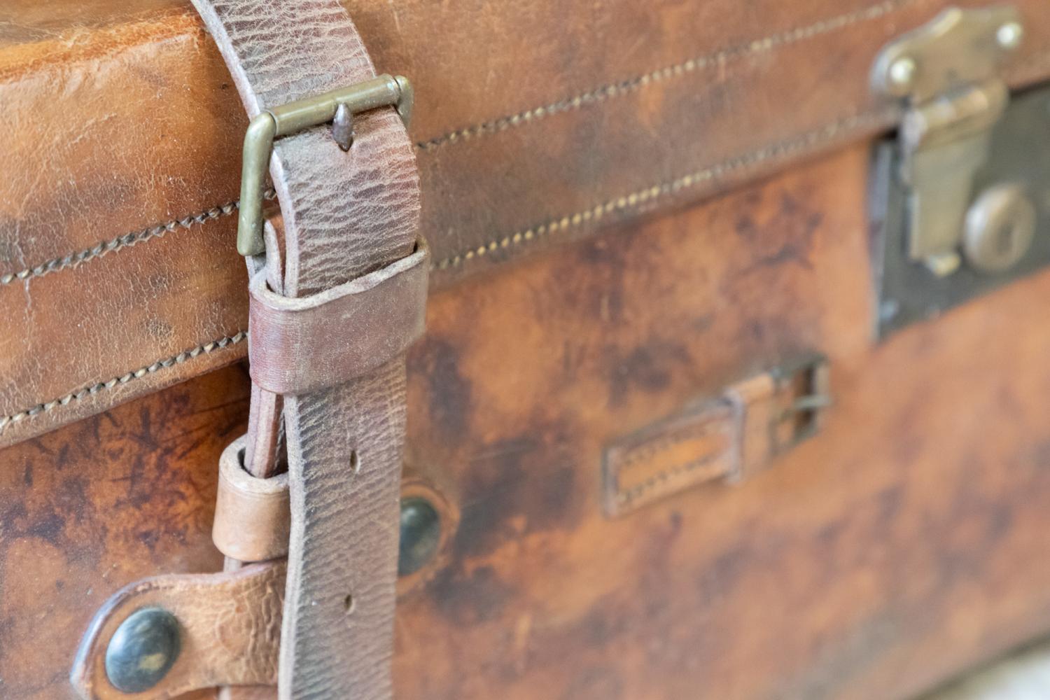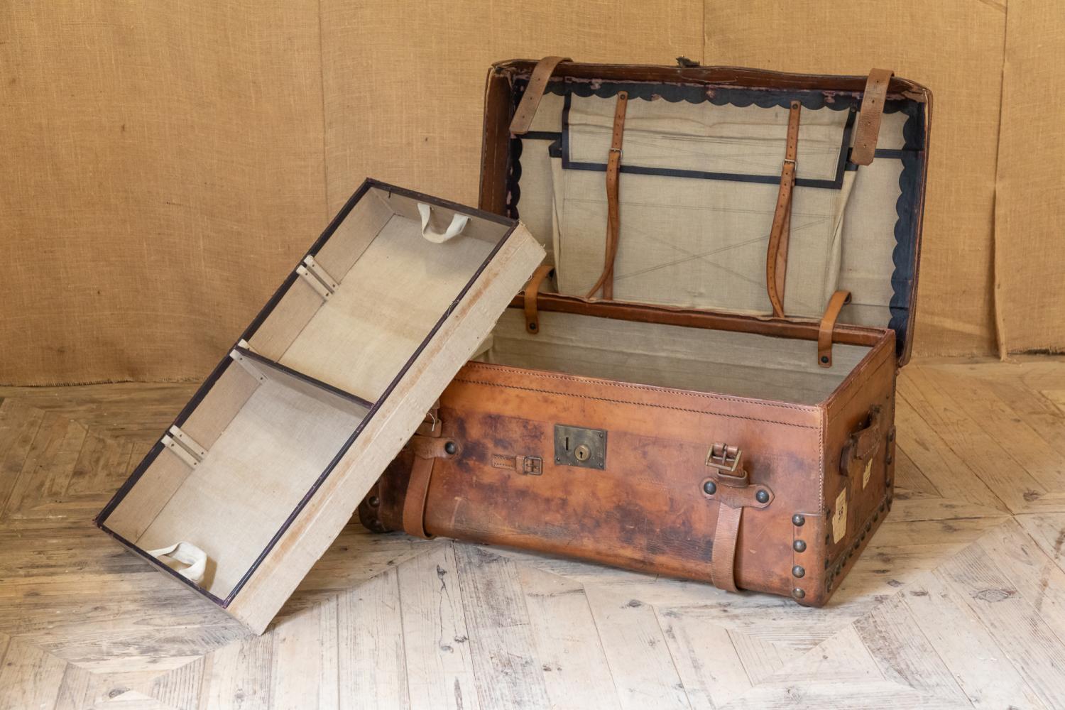A wonderful early 20th century leather steamer or motoring trunk. Complete with the leather straps and interior tray. The trunk retains a patchwork of original paper labels including the original makers details for C. Maude, Boar Lane, Leeds.