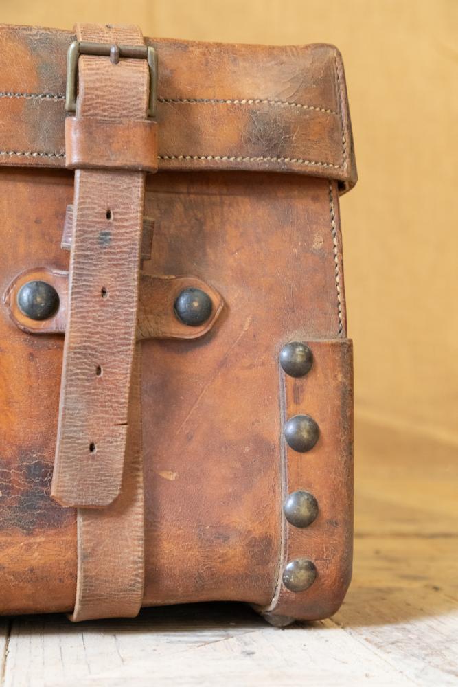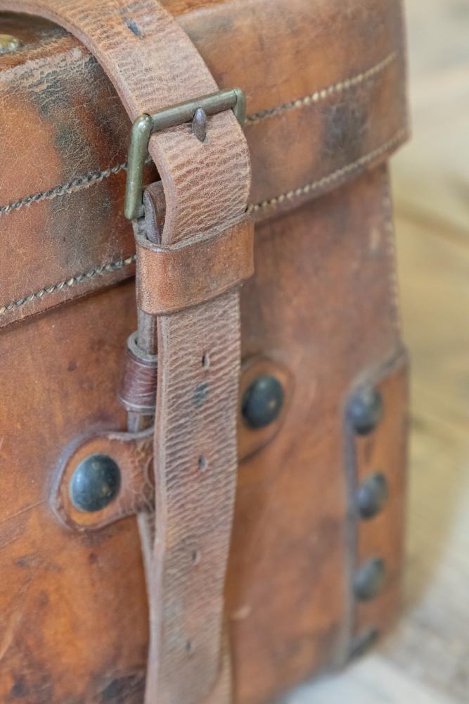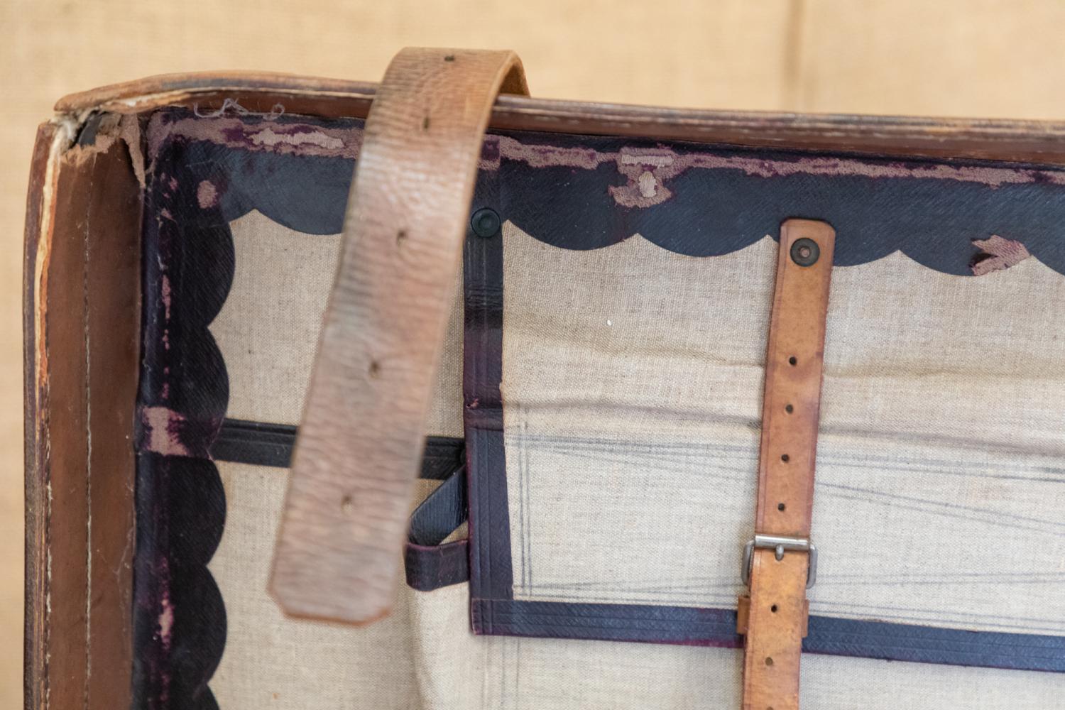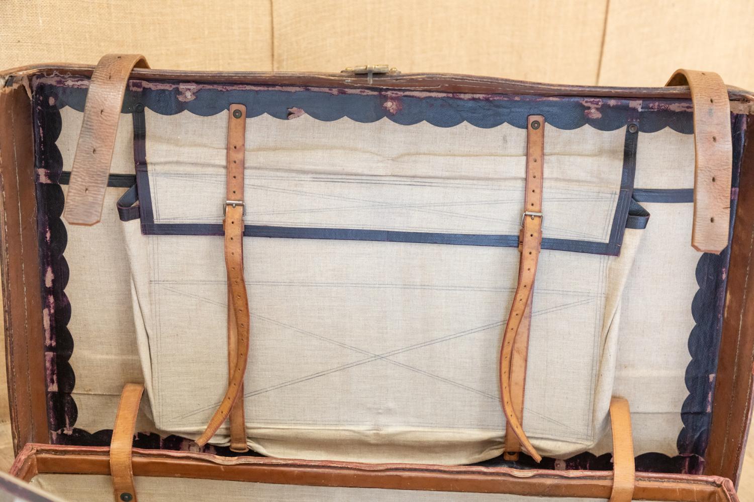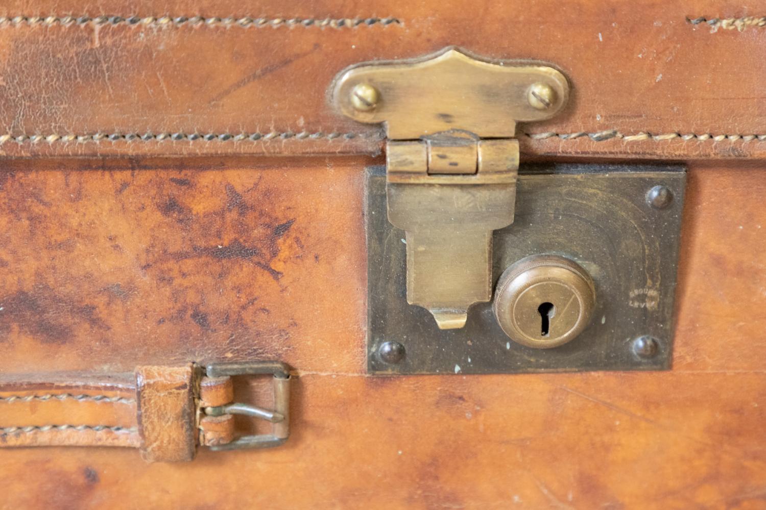A wonderful early 20th century leather steamer or motoring trunk. Complete with the leather straps and interior tray. The trunk retains a patchwork of original paper labels including the original makers details for C. Maude, Boar Lane, Leeds.