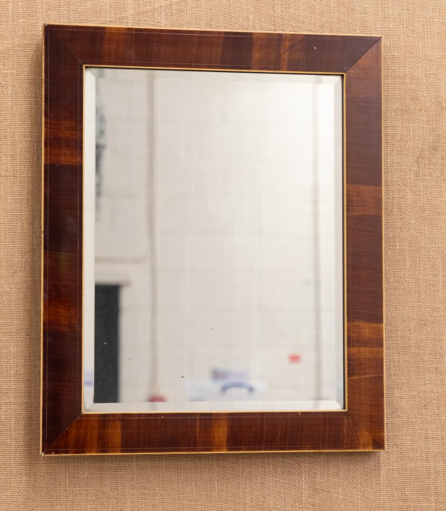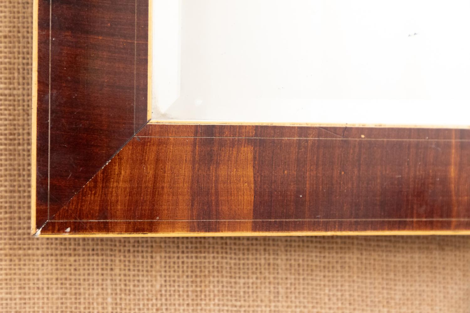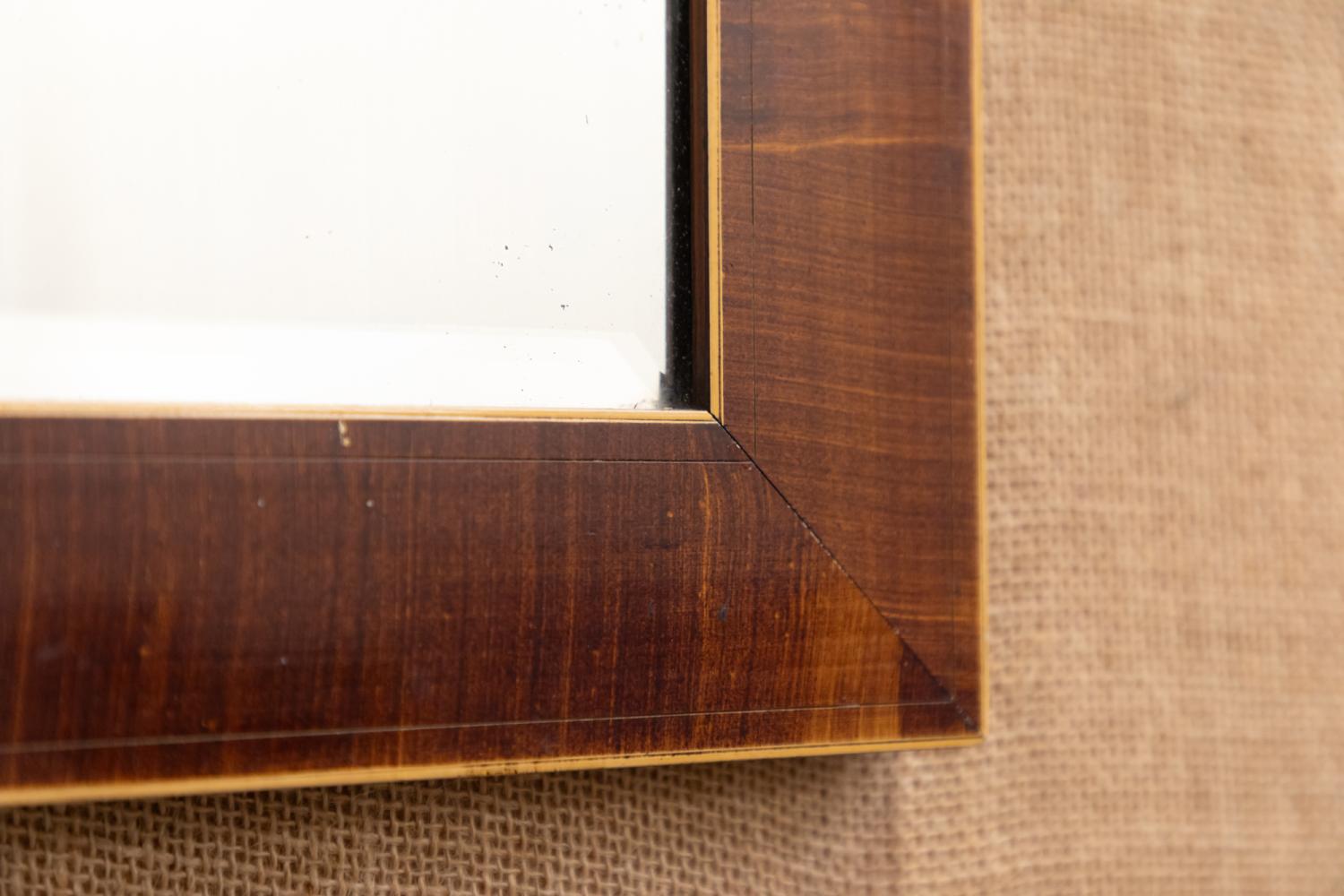 A superb rectangular mahogany mirror with a bevelled glass mirror plate. The veneers are beautifully cut giving a vibrant and striking look to the frame enhanced with a narrow box wood strung border. Retaining the original pine back boards and paper.
