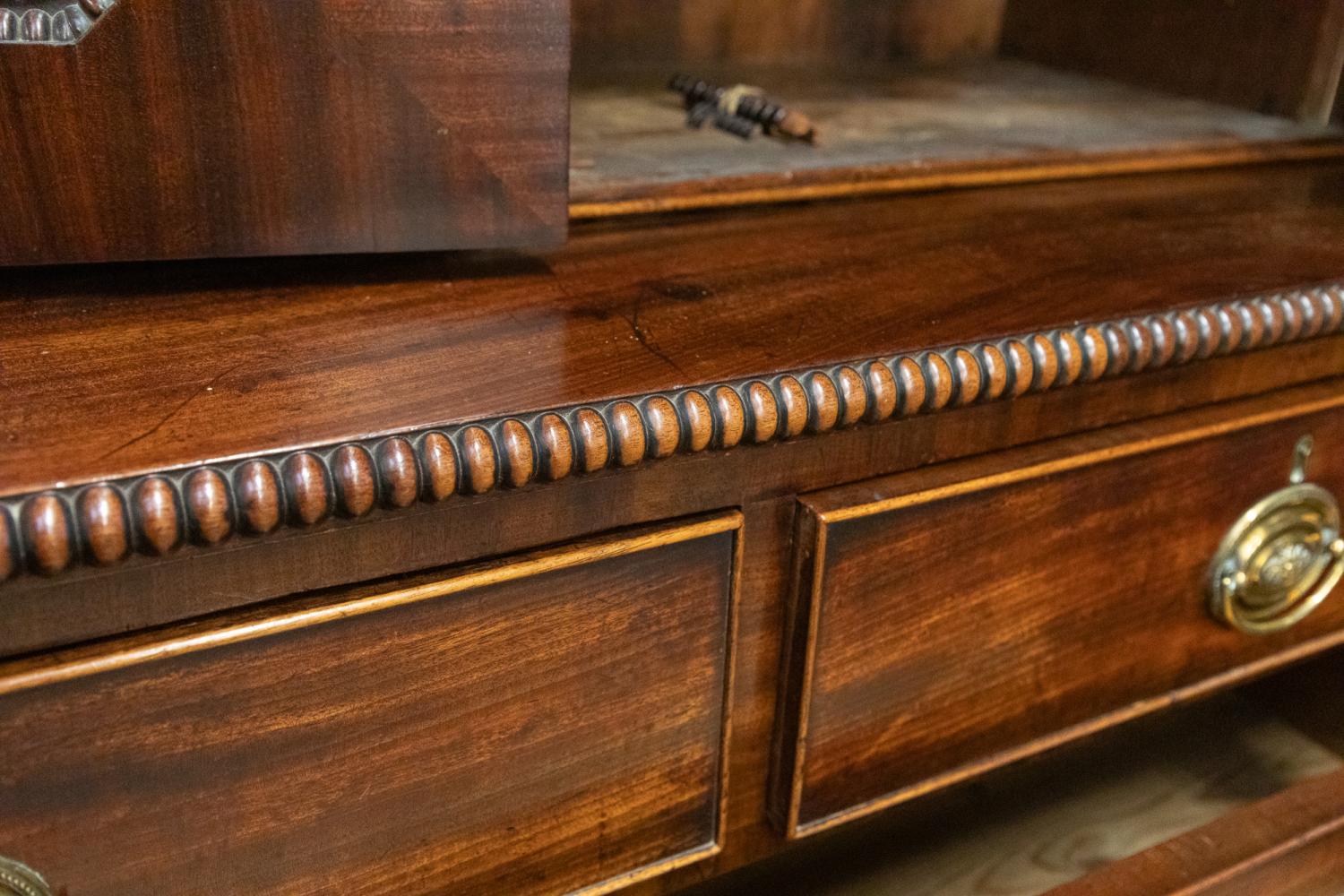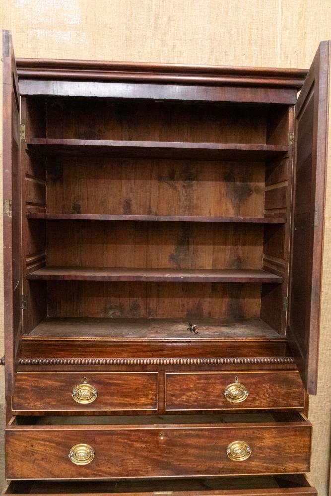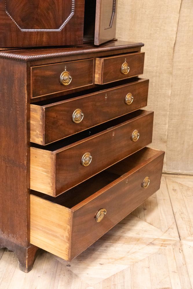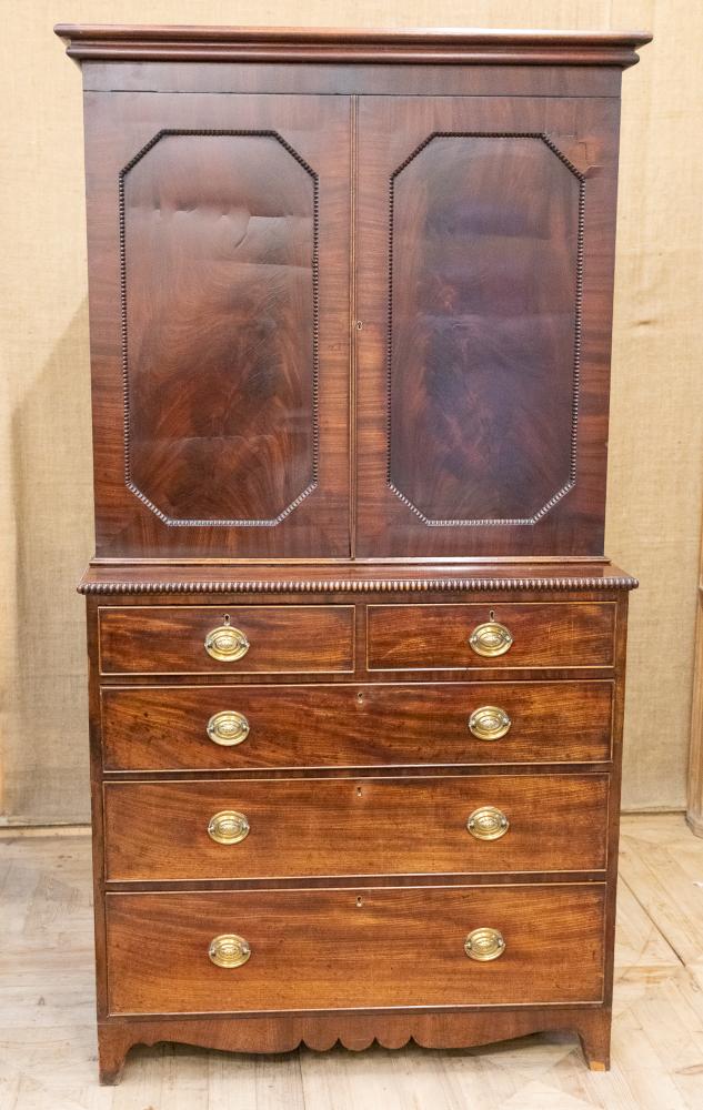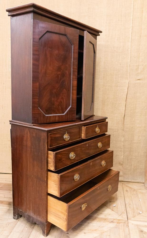 A beautiful early to mid 19th century mahogany press cupboard comprising of a cupboard top with twin doors that reveal a shelved interior. The cupboard sits above a chest of drawers with two short sitting above three long graduating drawers. With a lovely bobbin turned trim to the panel doors and to the edge of the chest.