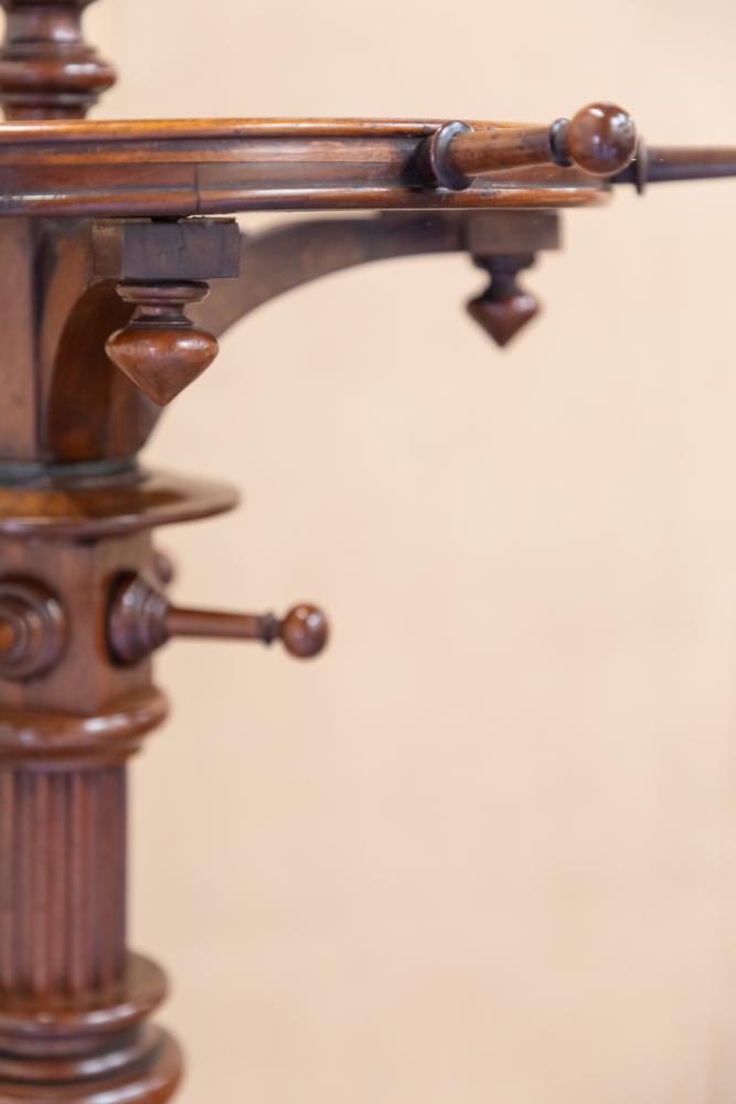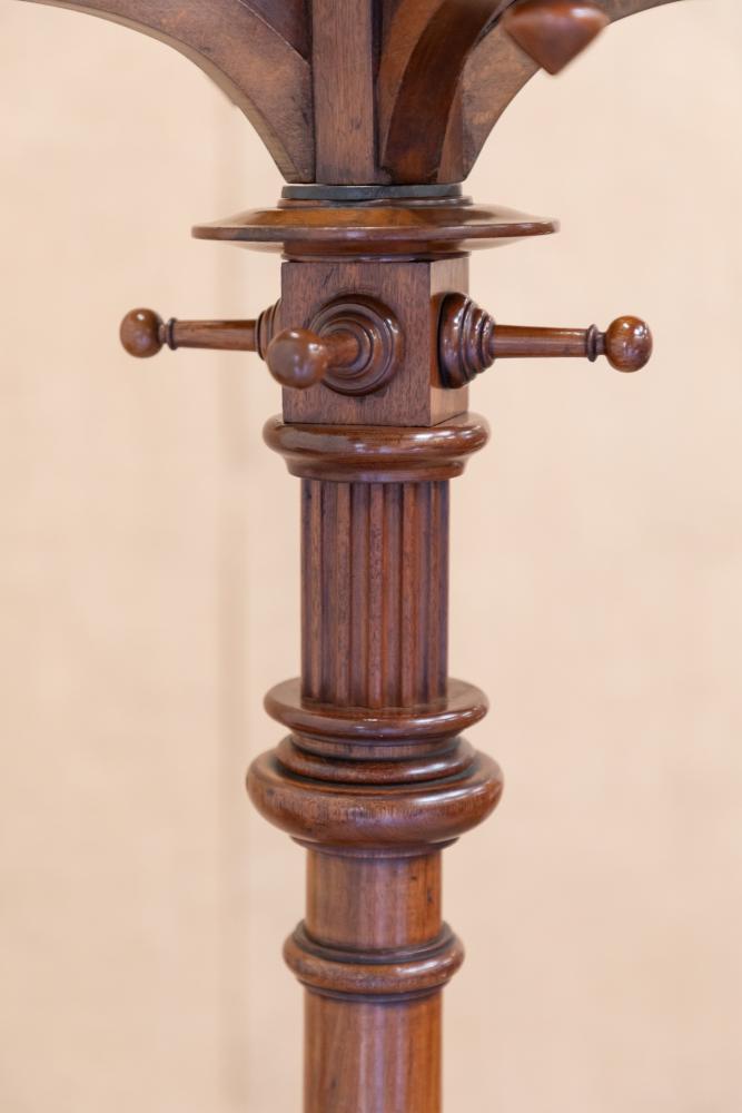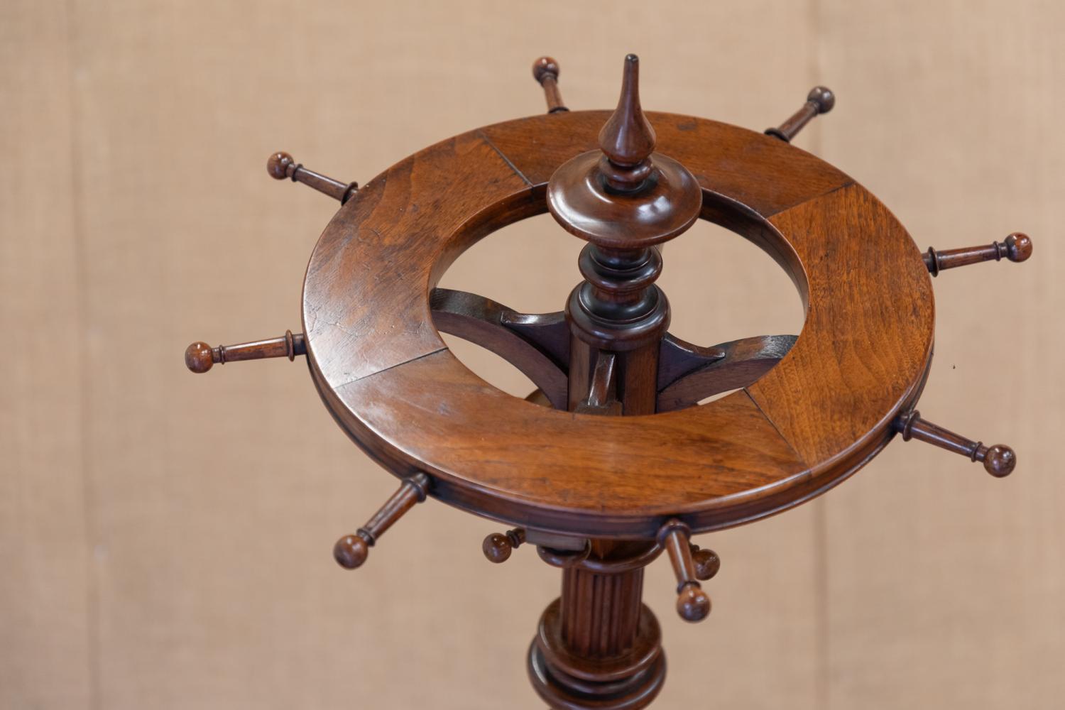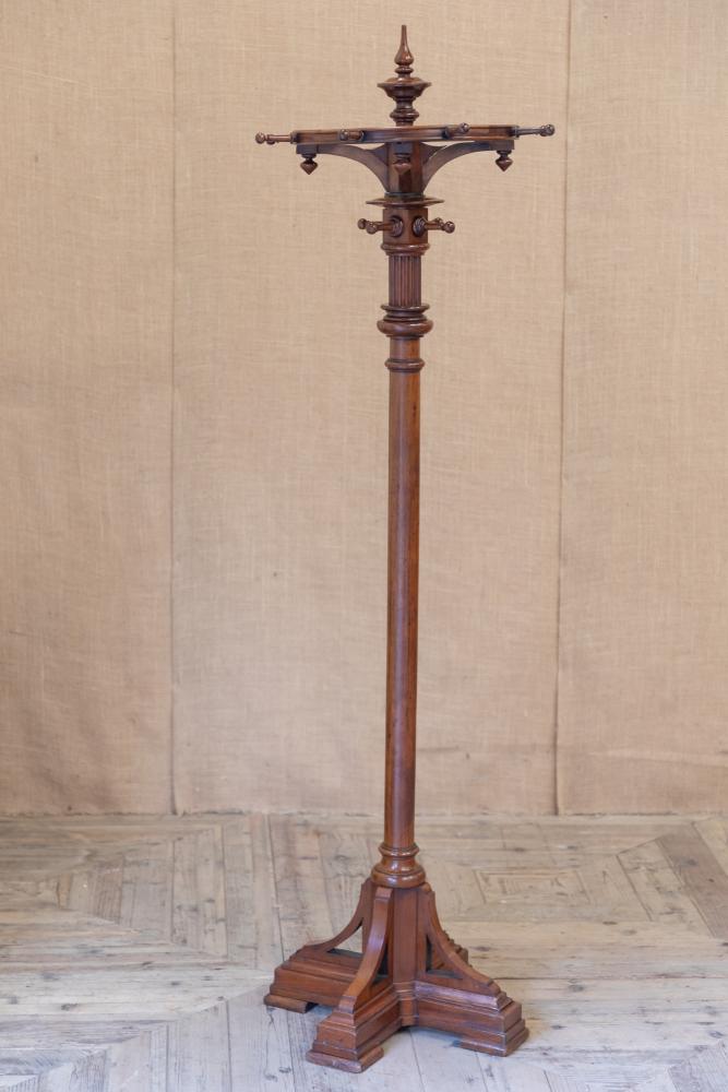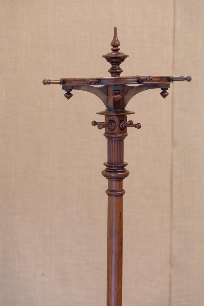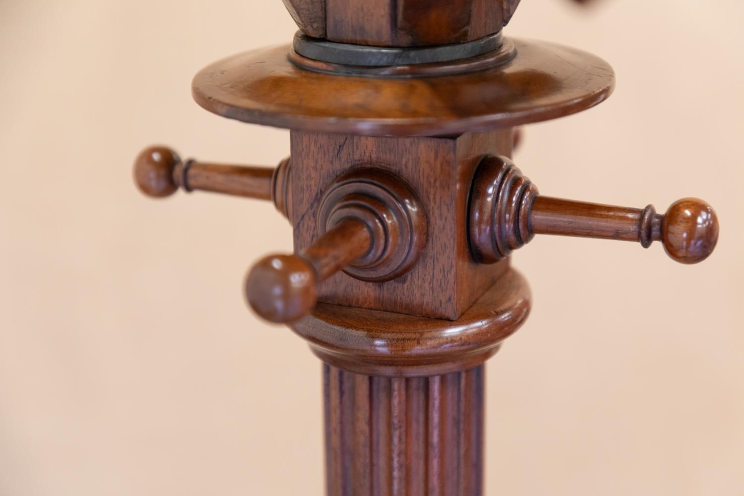 A beautiful quality English Country House 19th century mahogany revolving hat and coat stand. The stand is raised on a stepped base with central turned column support mounted with four fixed coat hooks that sit below a circular revolving wheel mounted with further pegs.