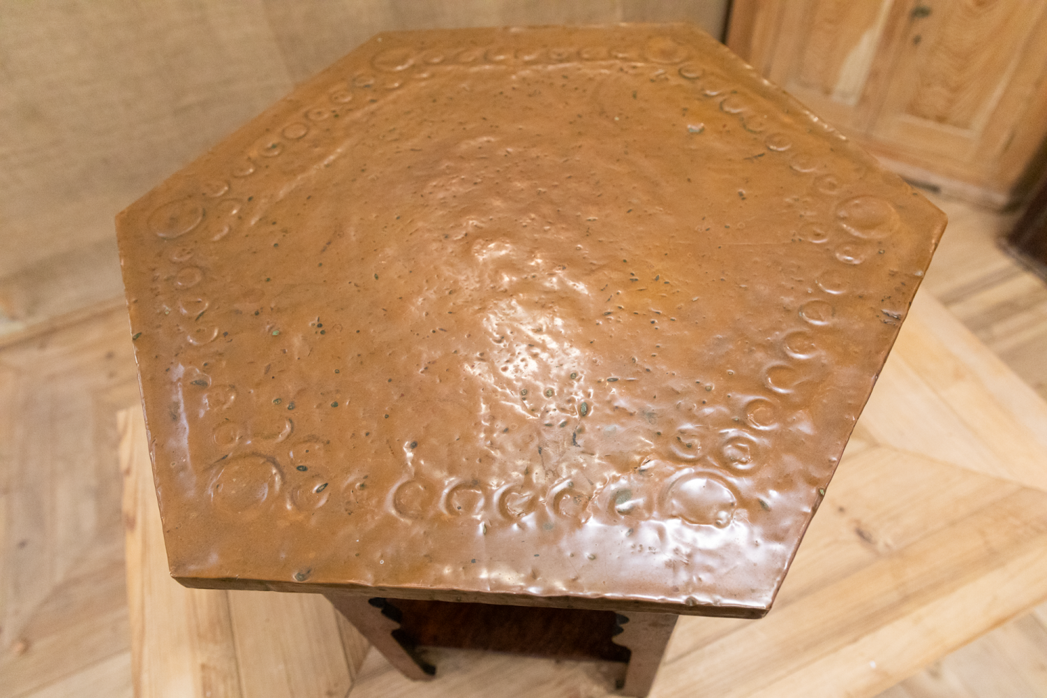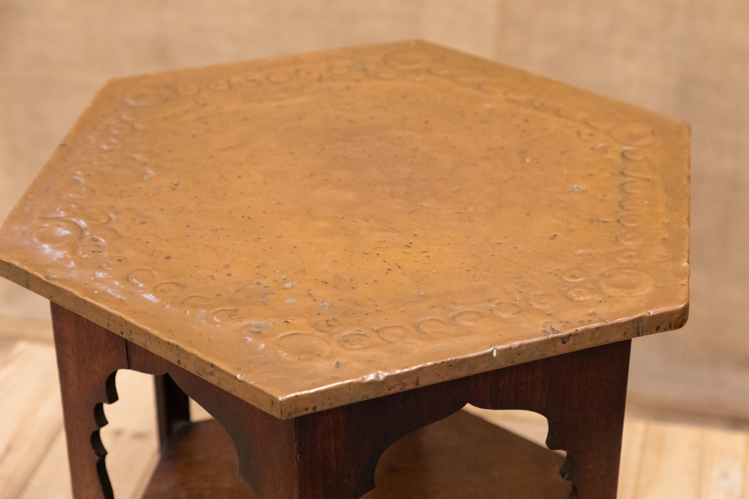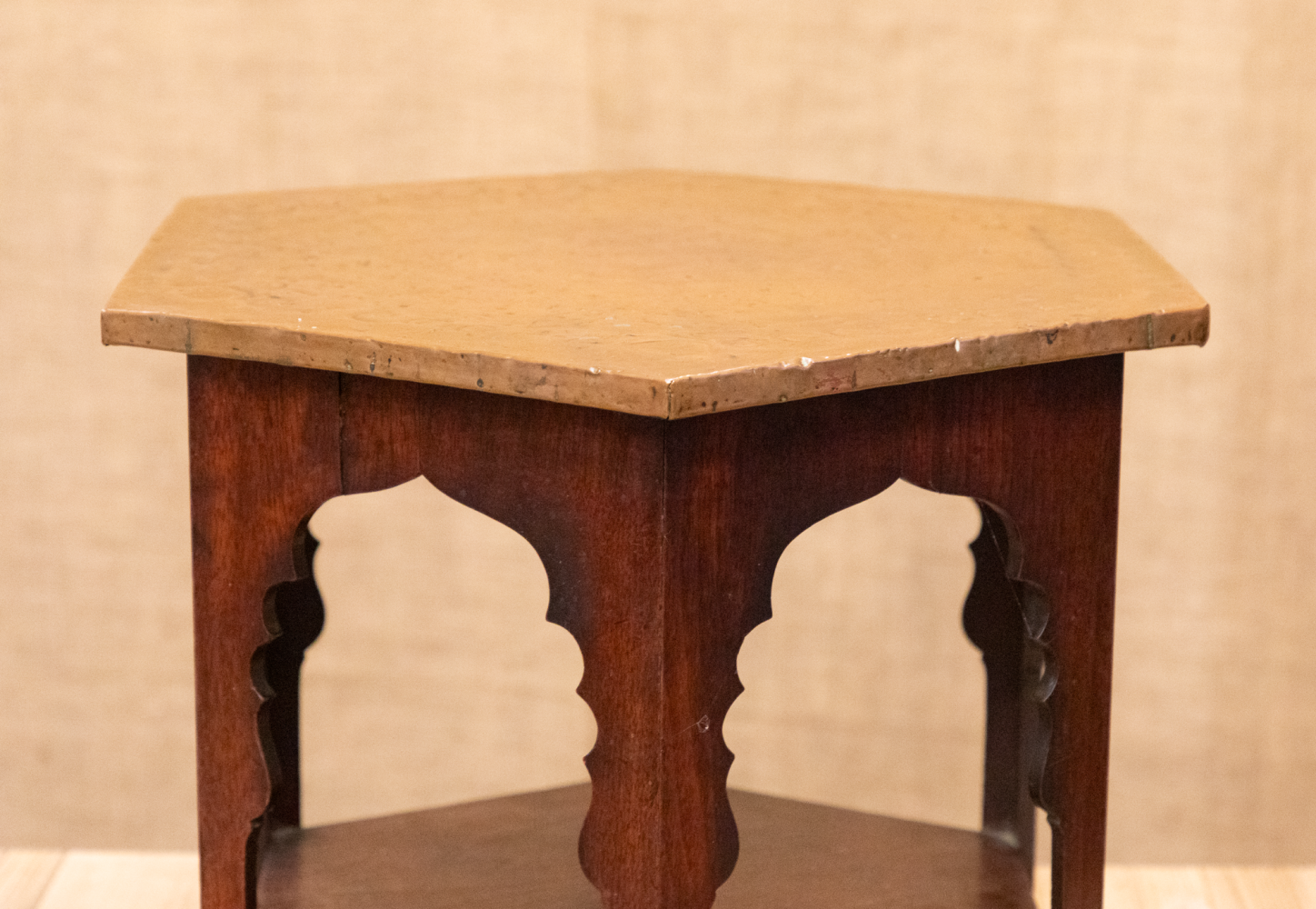 A wonderful late 19th century Liberty style moorish table in mahogany with a hammered copper top. The octagonal two tier table with chamfered supports and spade feet.