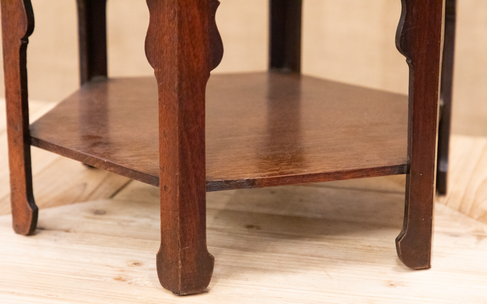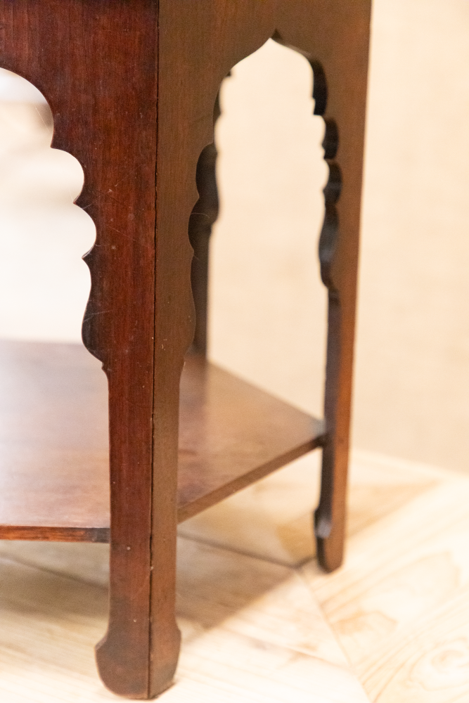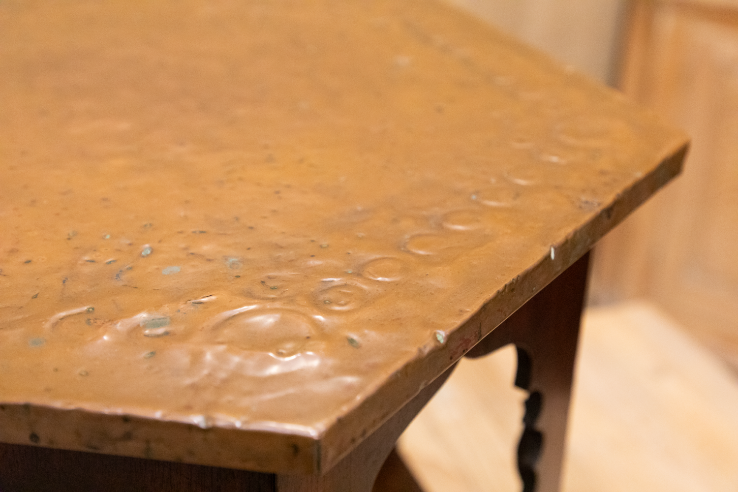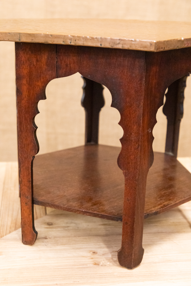 A wonderful late 19th century Liberty style moorish table in mahogany with a hammered copper top. The octagonal two tier table with chamfered supports and spade feet.