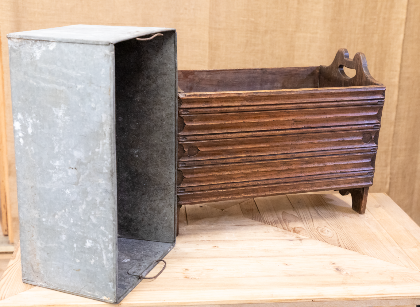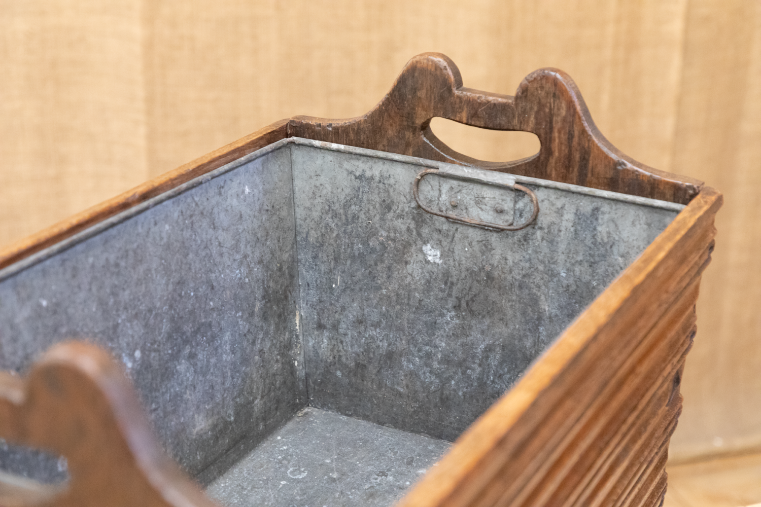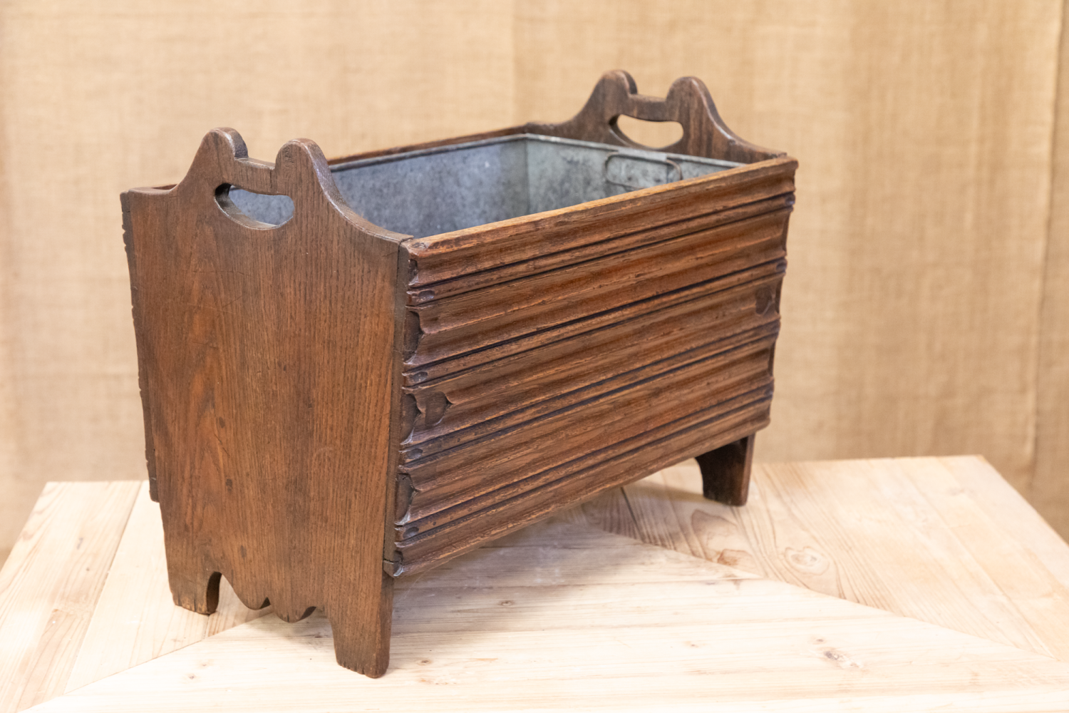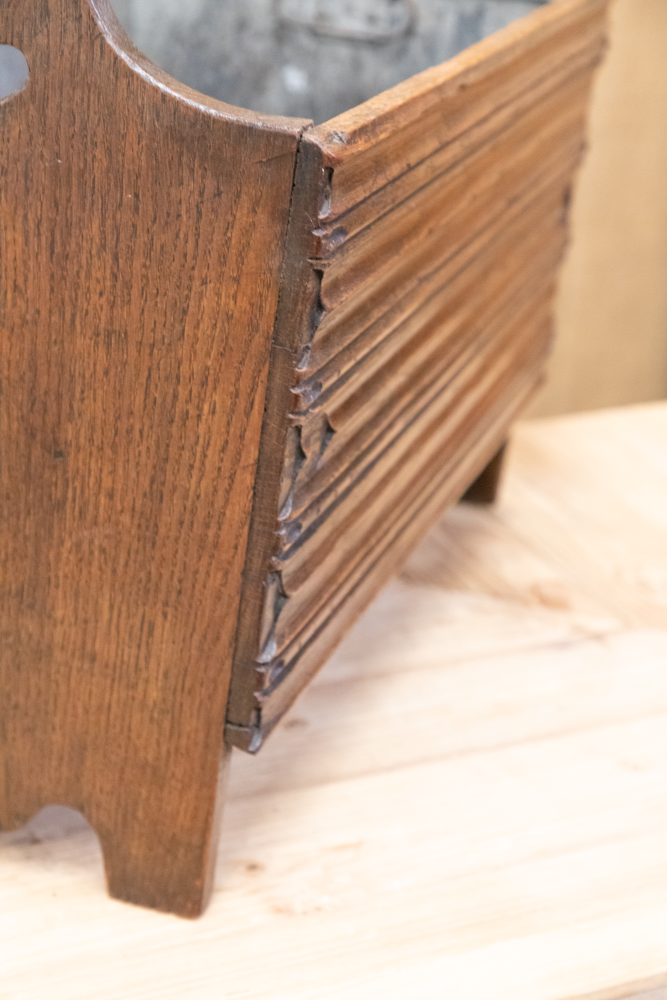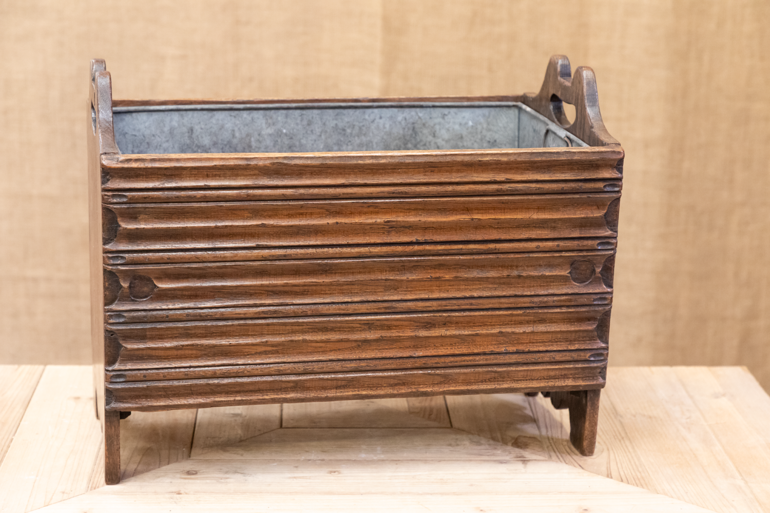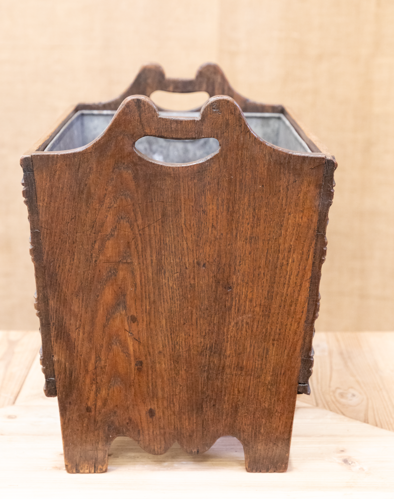 A fantastic late 19th century rectangular oak log box or jardiniere in the Carolean style with lovely linen fold carving and a fabulous colour. Together with a zinc lining.