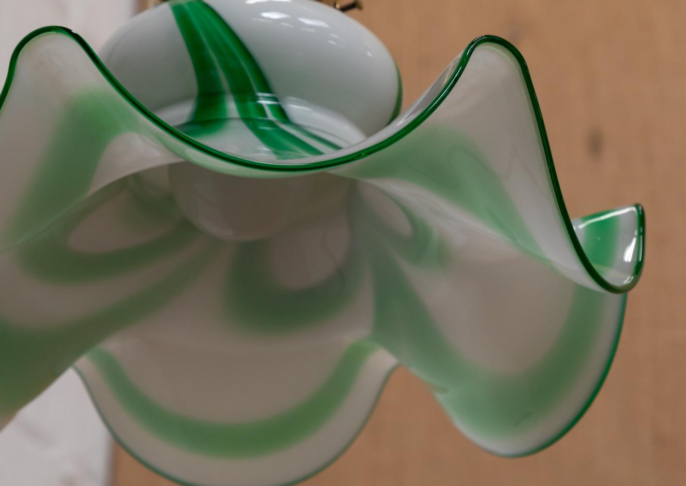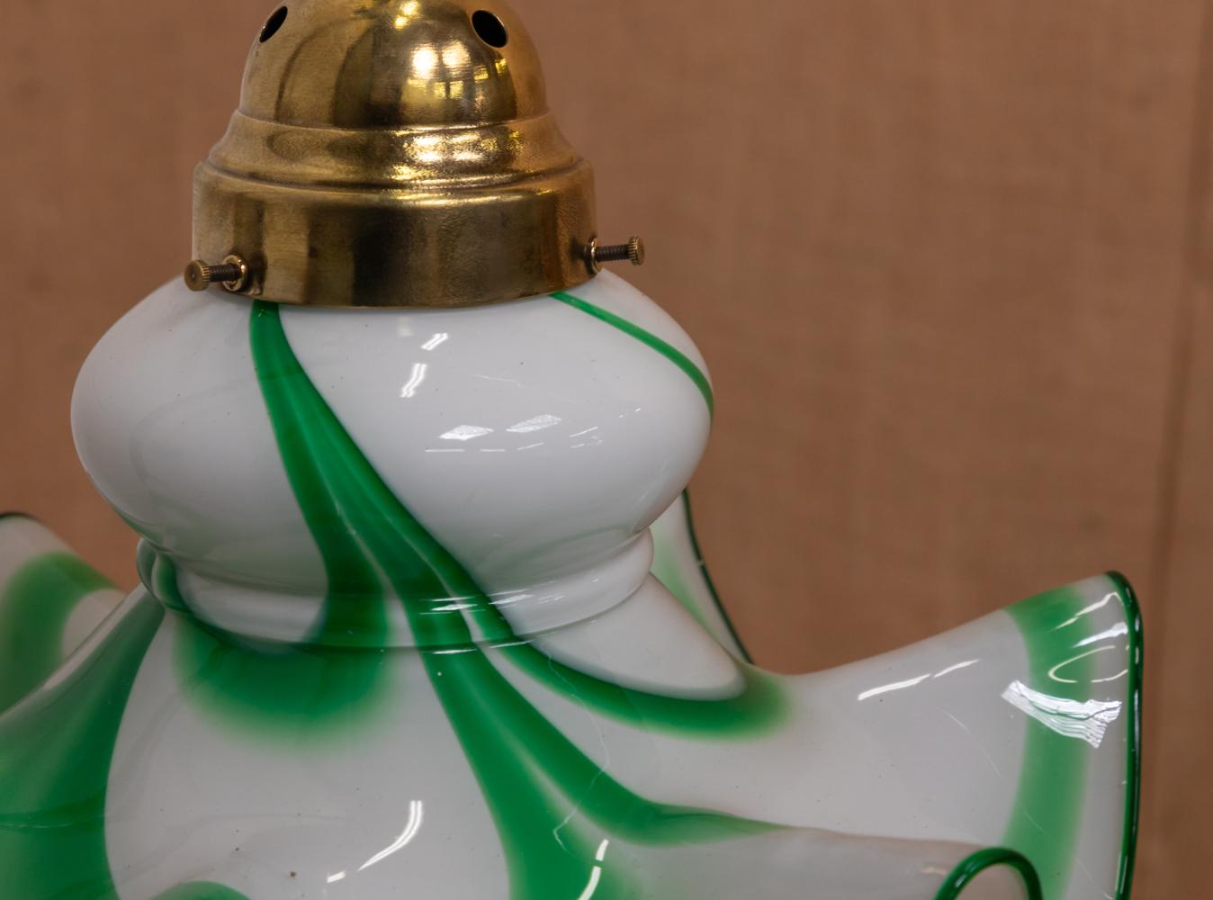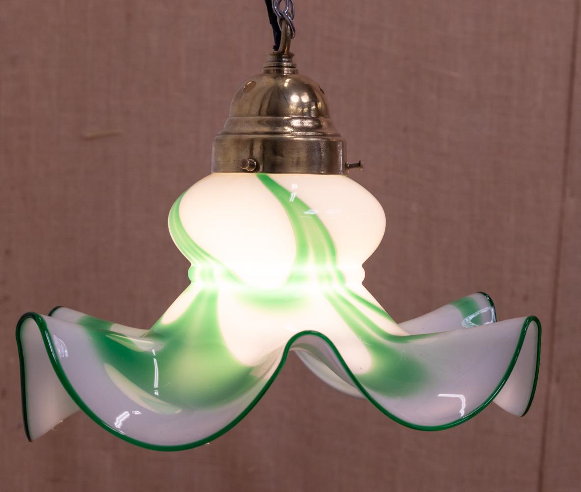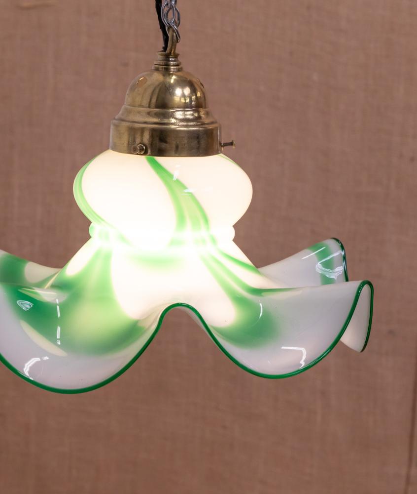 A stunning early to mid century green and opaline glass pendant lamp with a wonderful handkerchief shape. Complete with the original brass gallery, fully rewired and PAT tested.