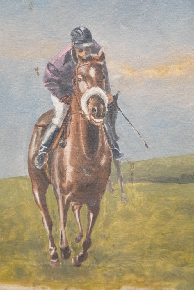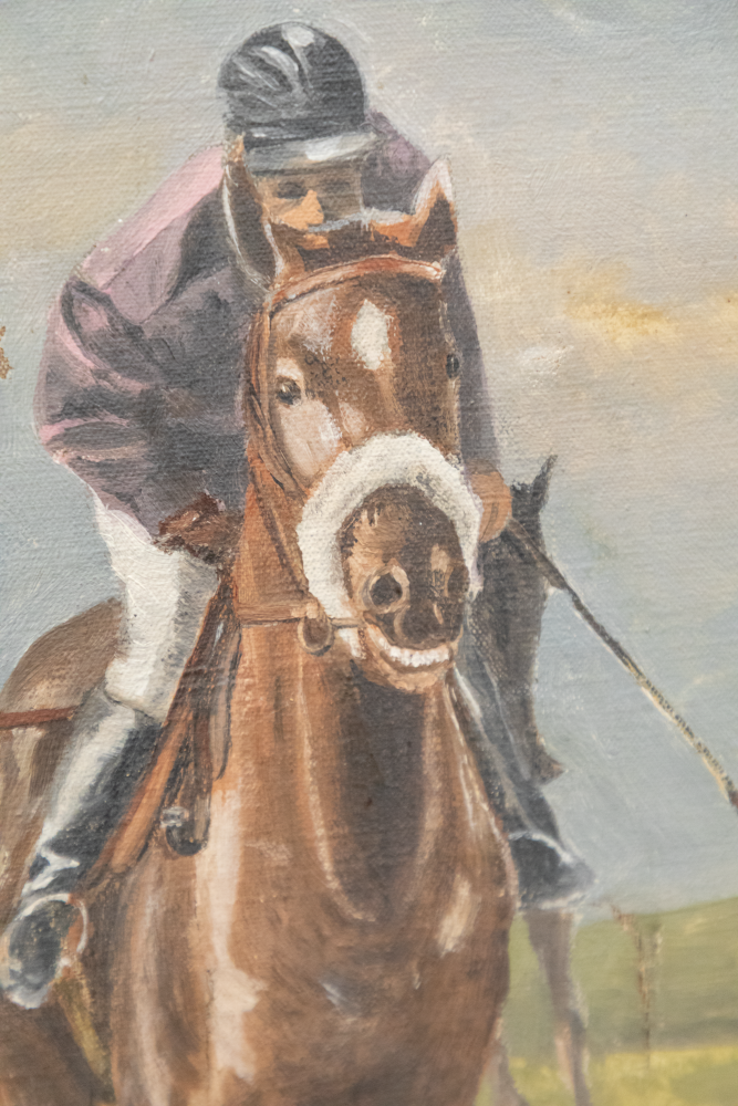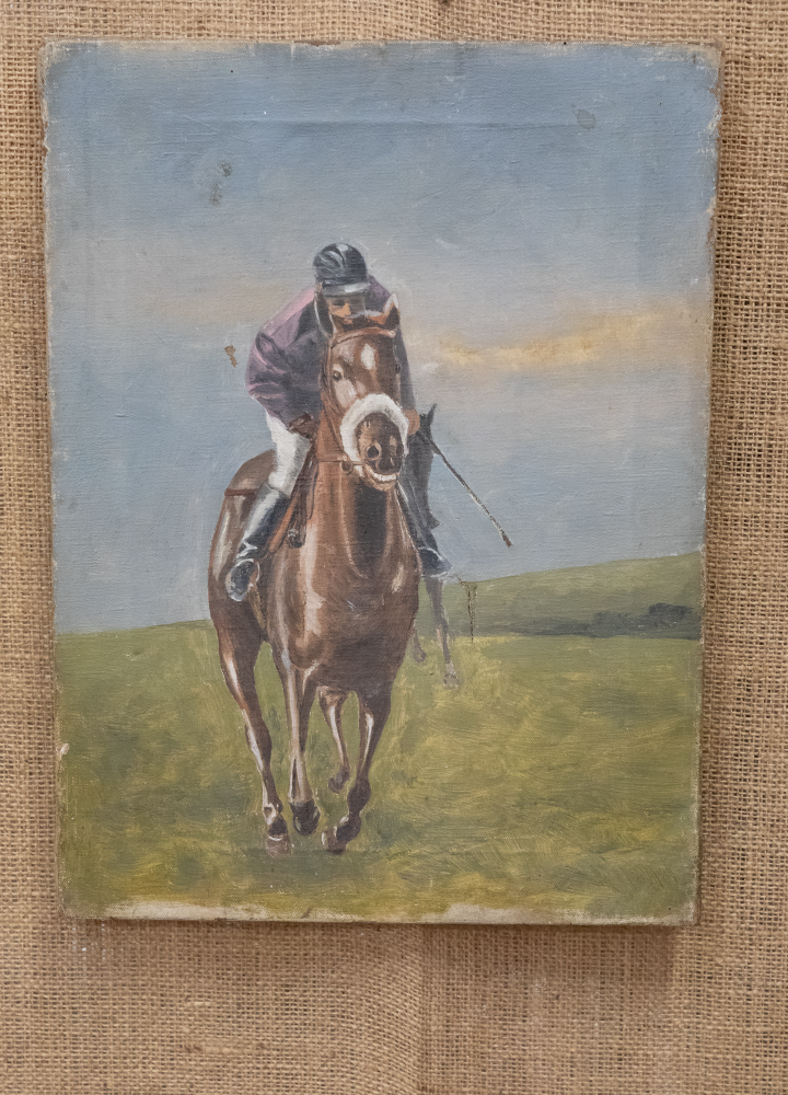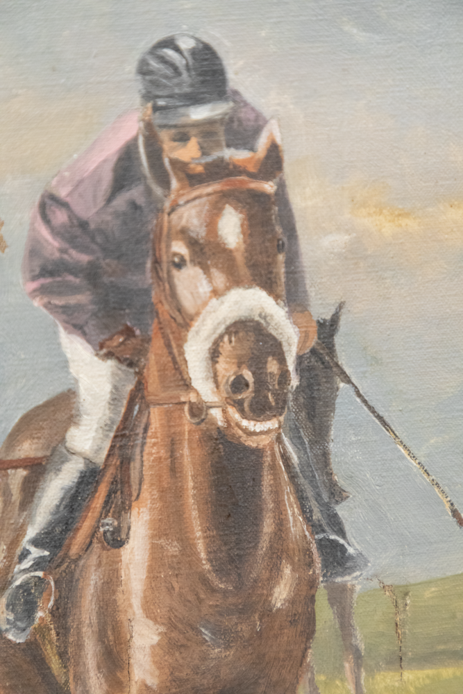 Good, The painting is unframed and has a small tear to the right of the jockeys foot (see image)
