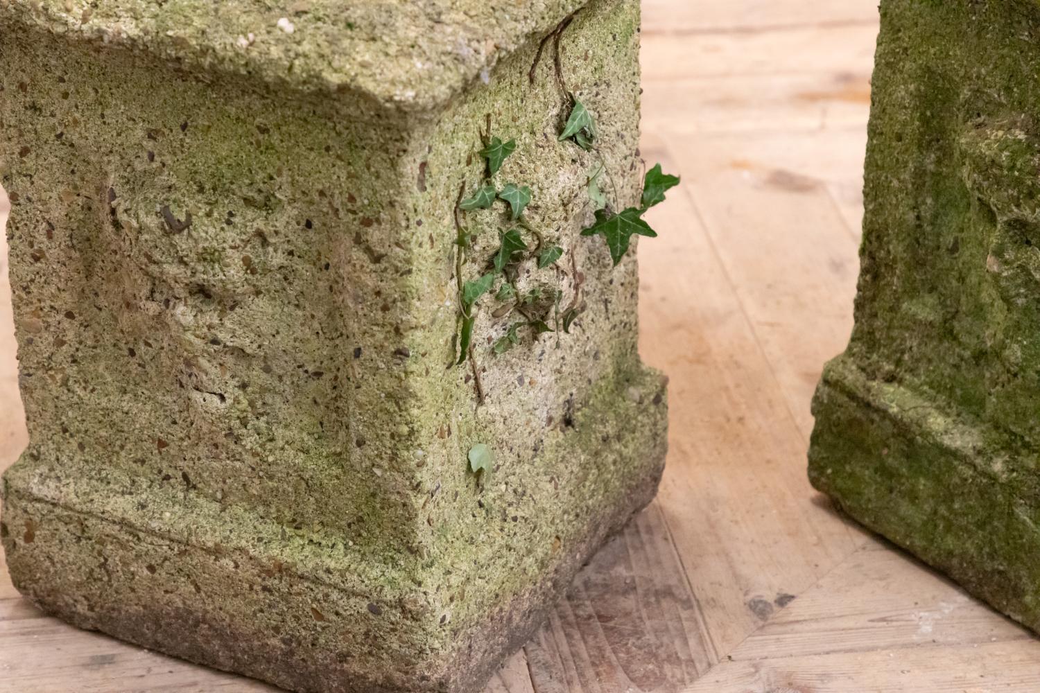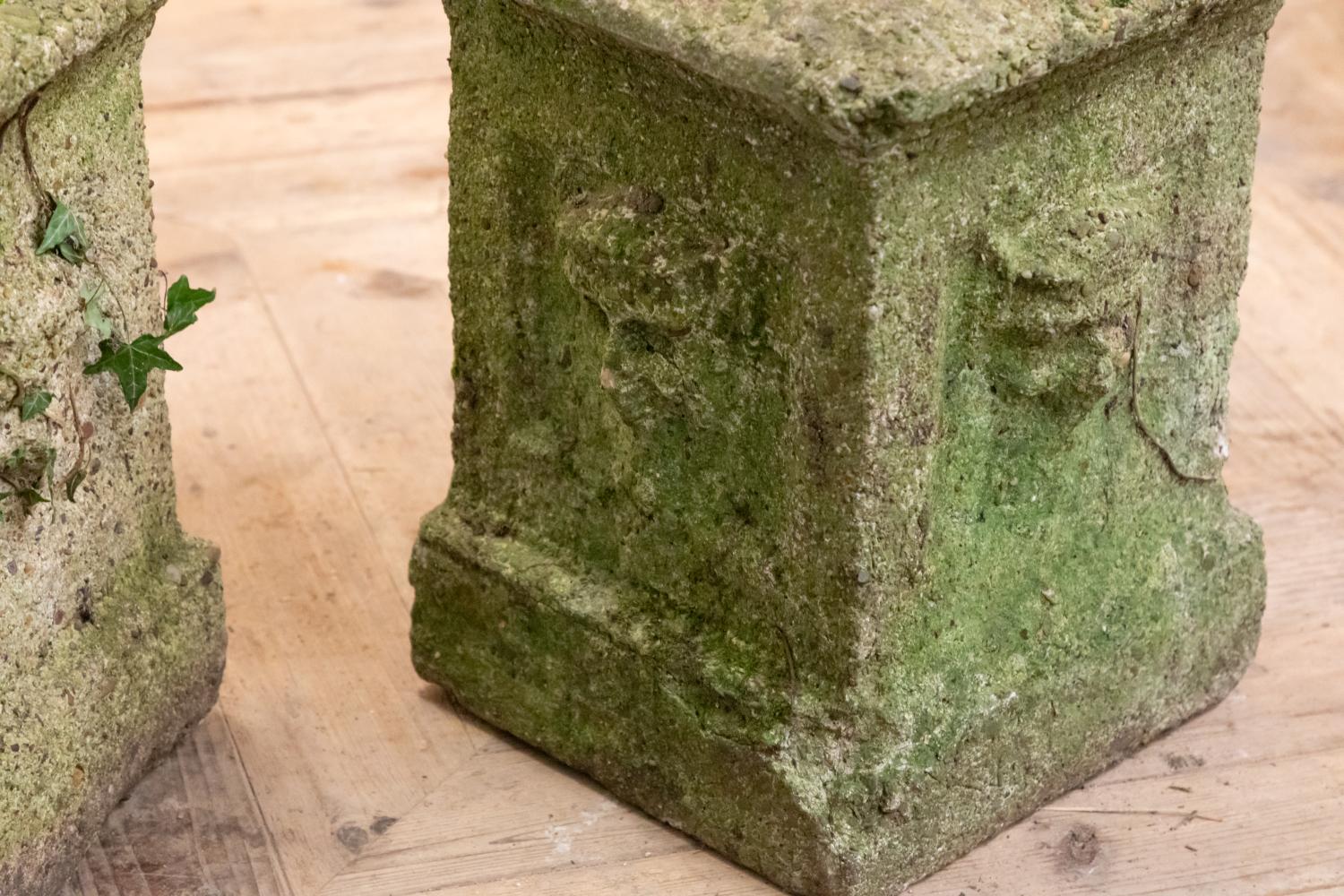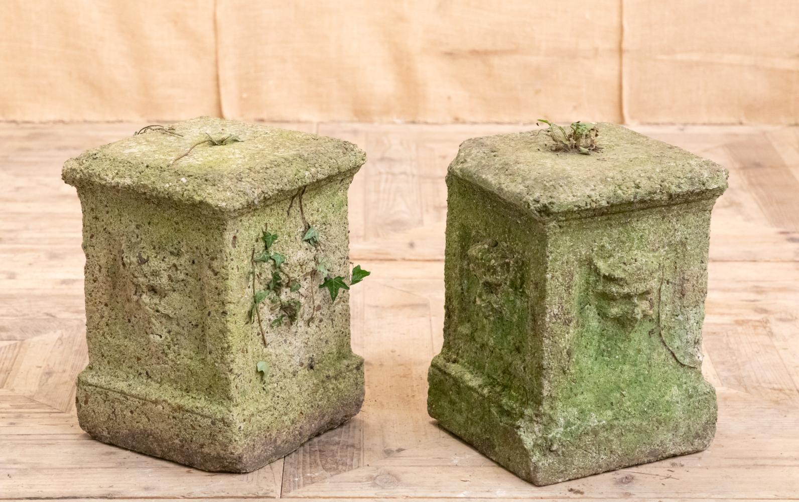 A wonderful pair of reconstituted stone plinths most probably made for a grotto or woodland garden. Each square plinth retains the cast detail of a nymph or green man to each side. Well weathered with a lovely worn country house look.