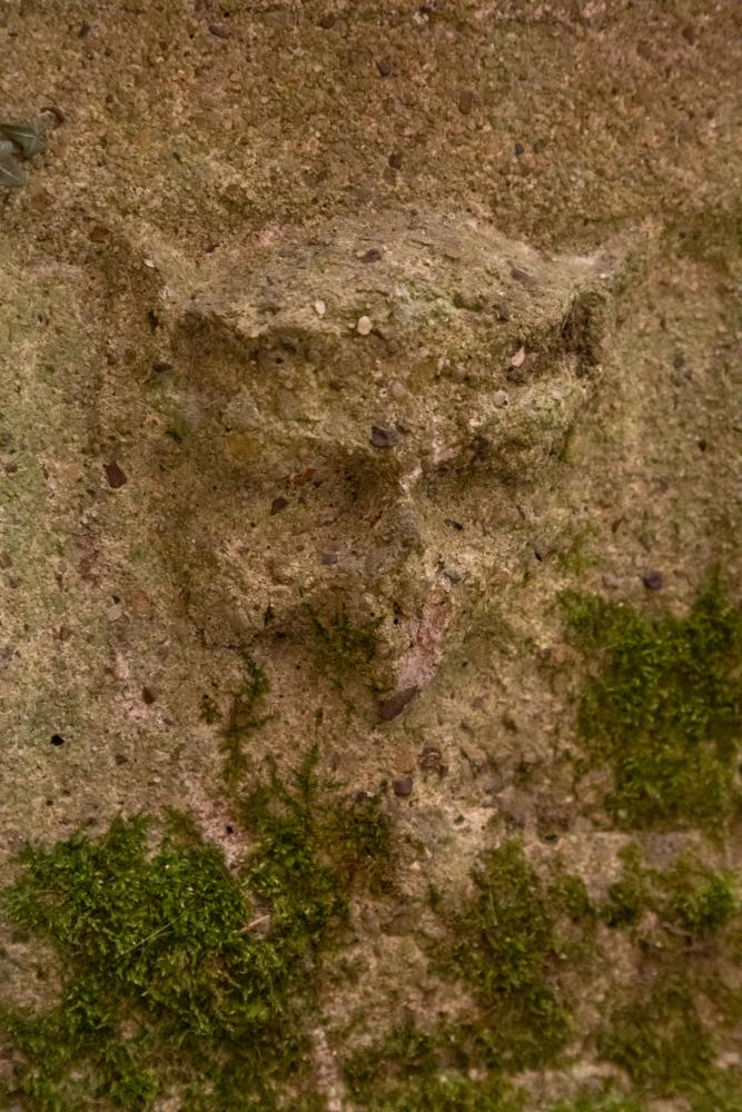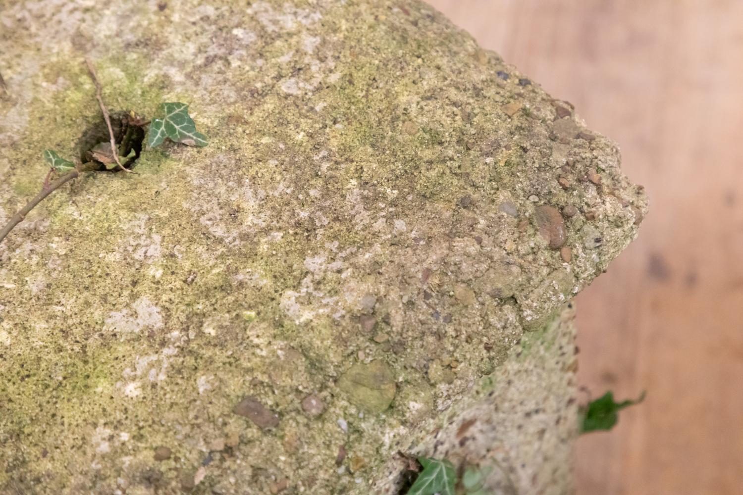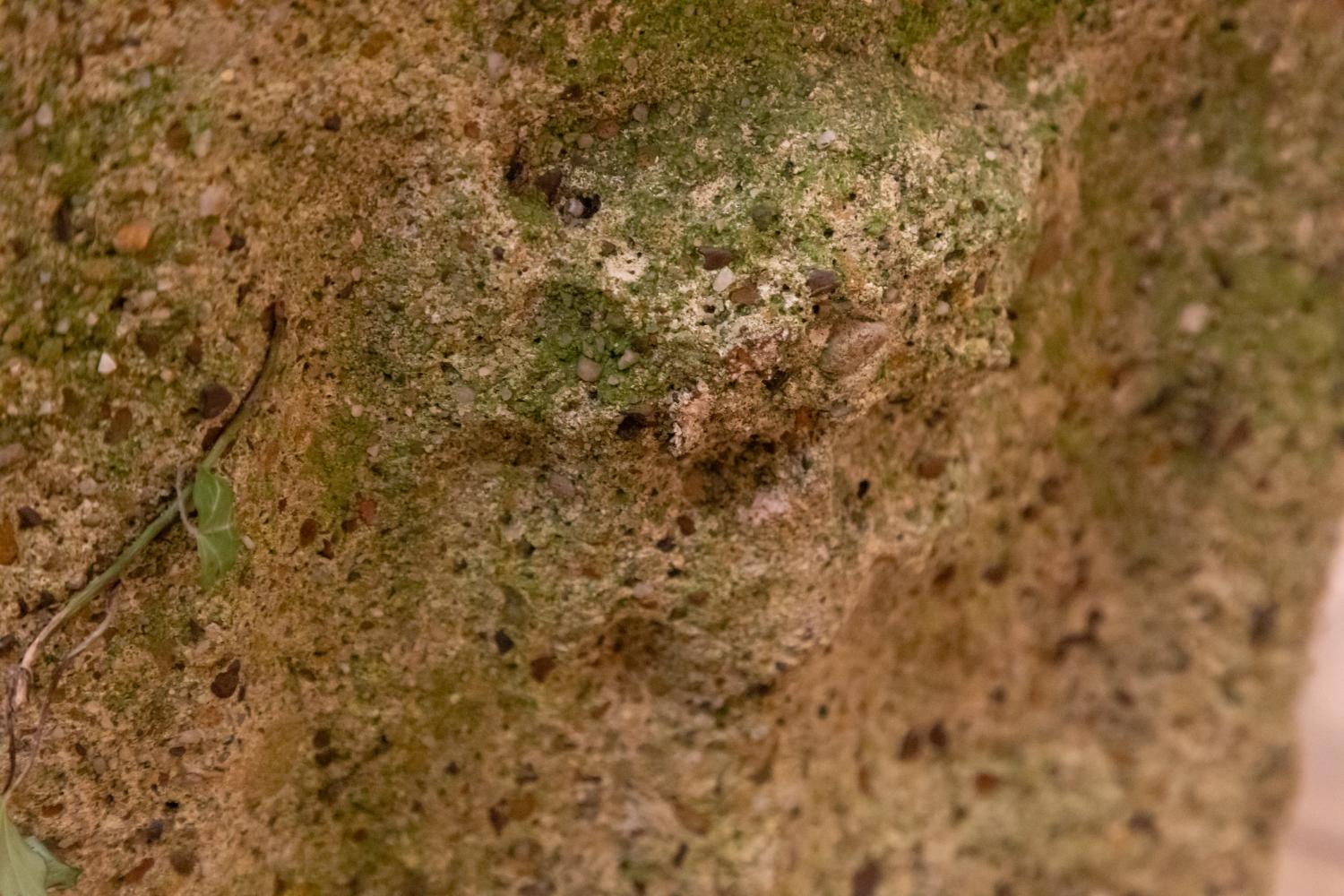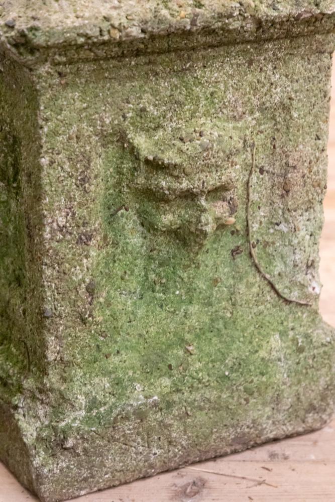 A wonderful pair of reconstituted stone plinths most probably made for a grotto or woodland garden. Each square plinth retains the cast detail of a nymph or green man to each side. Well weathered with a lovely worn country house look.
