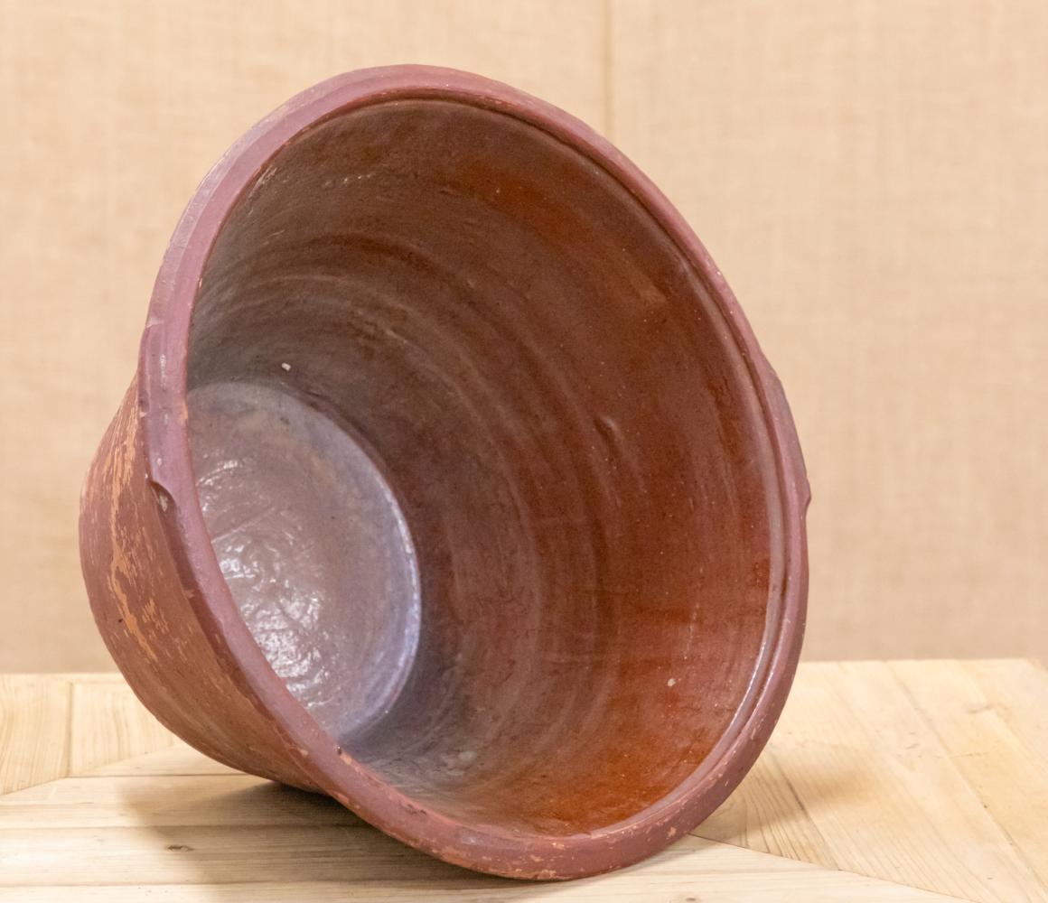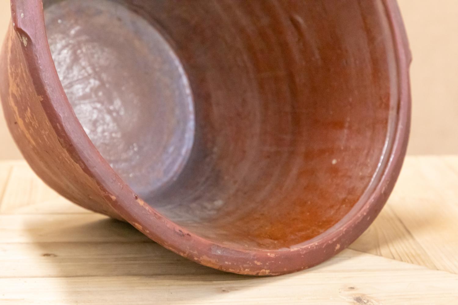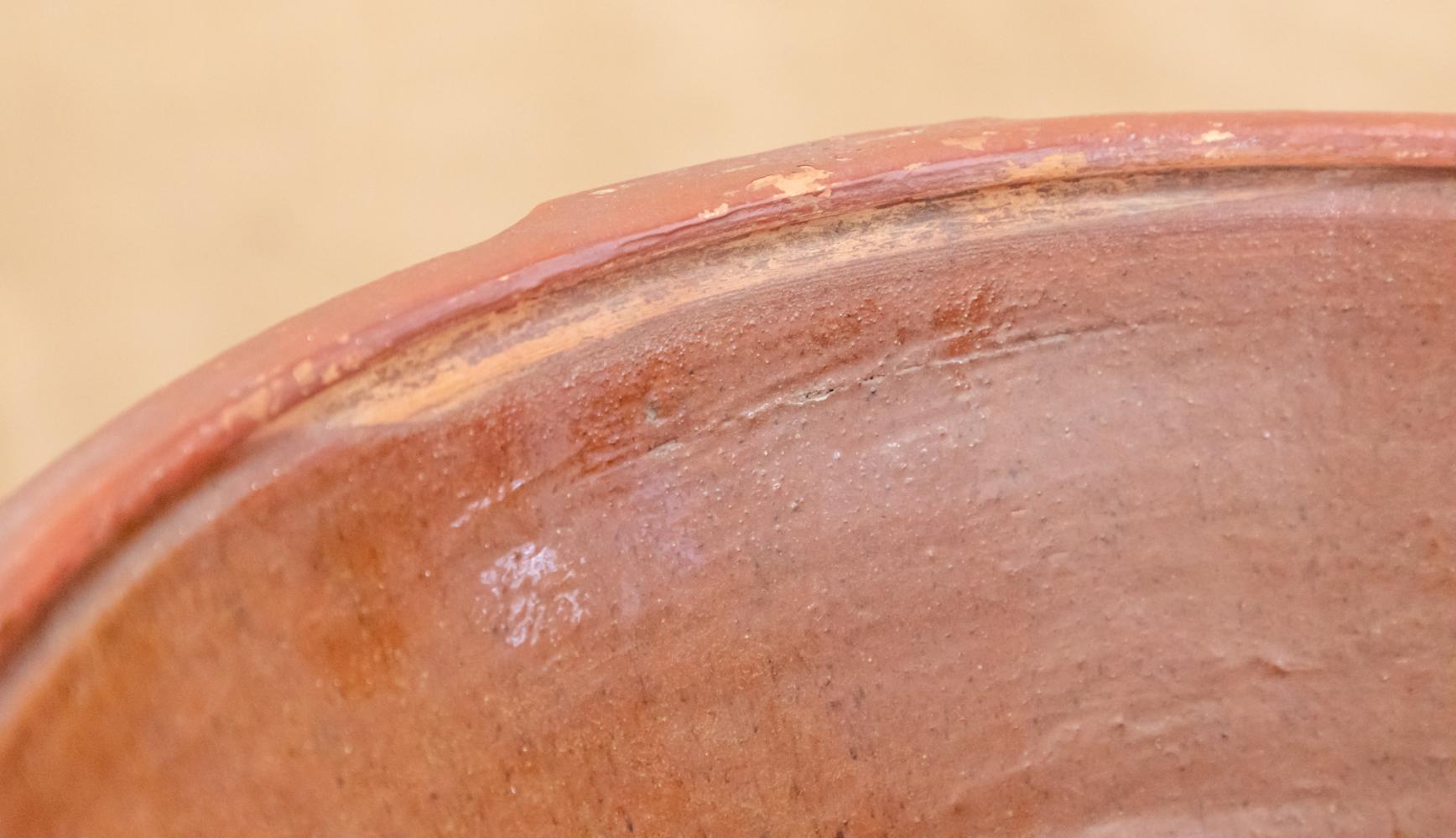 A lovely un-glazed red terracotta dairy bowl or pancheon of large proportions.