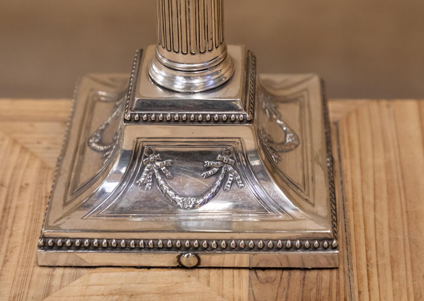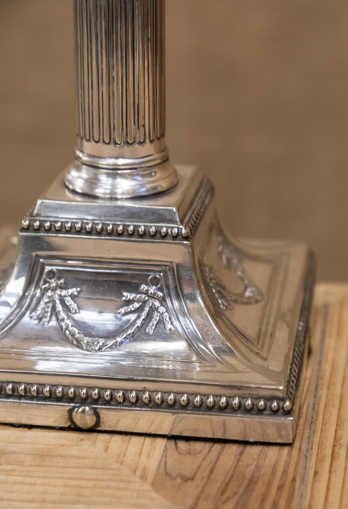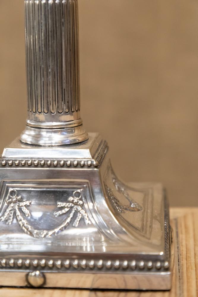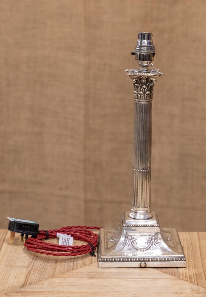 A wonderful early 20th century silver plated table lamp in the form of a Corinthian column mounted on a stepped base. Fully rewired and PAT tested.