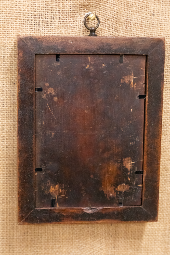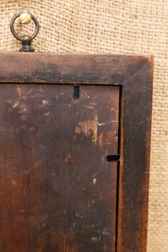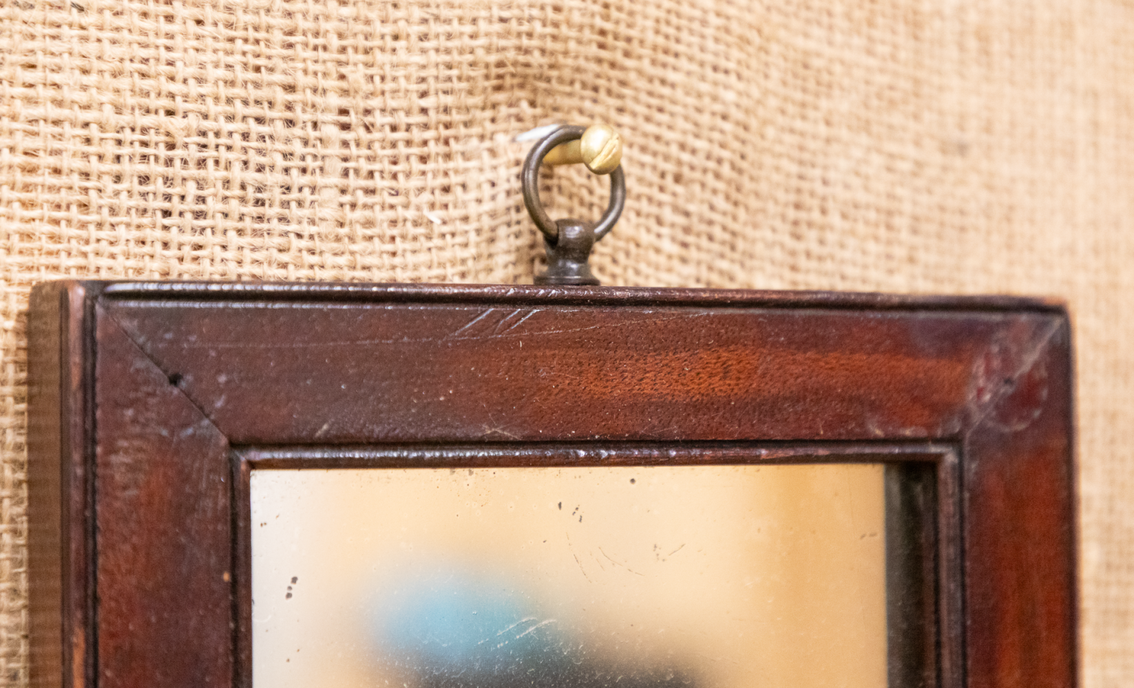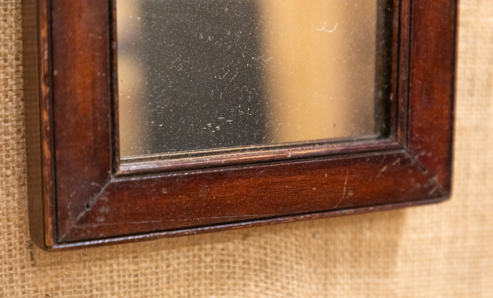 A beautiful early 19t century mahogany mirror of small proportions. The mahogany frame has a wonderful colour and patina and is mounted by one gilt brass suspension loop.