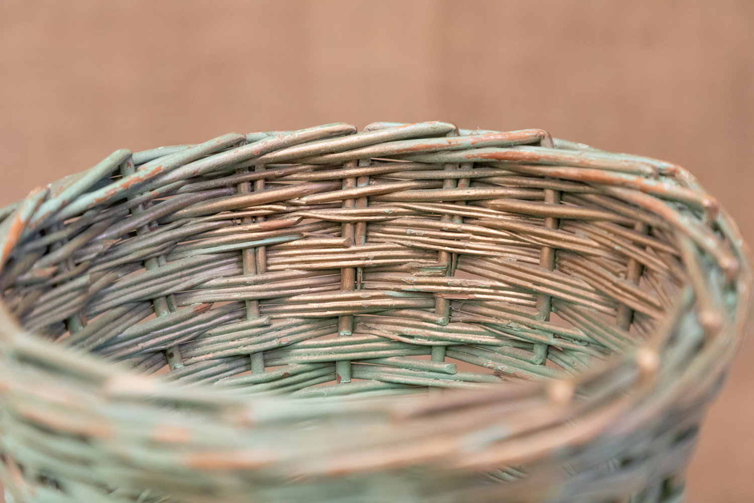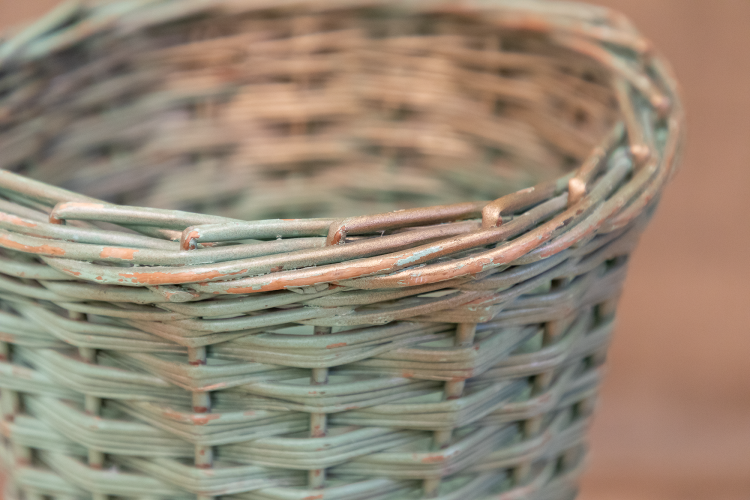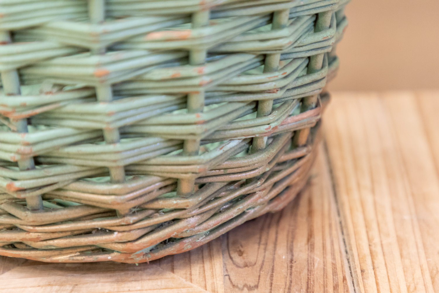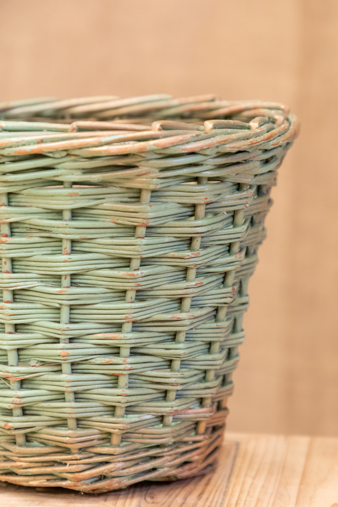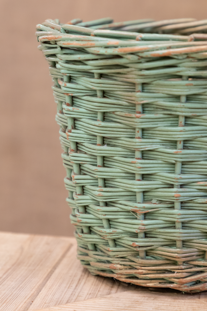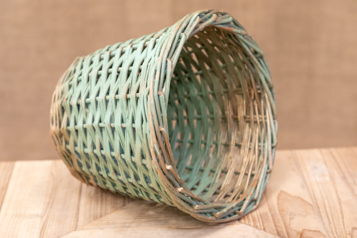 A fabulous early 20th century woven cane or wicker waste paper basket in the original green and gold paint.