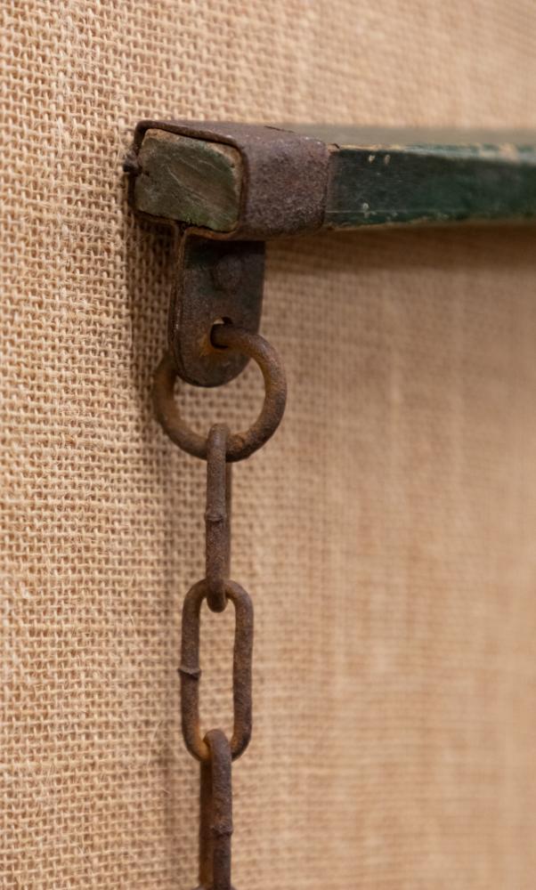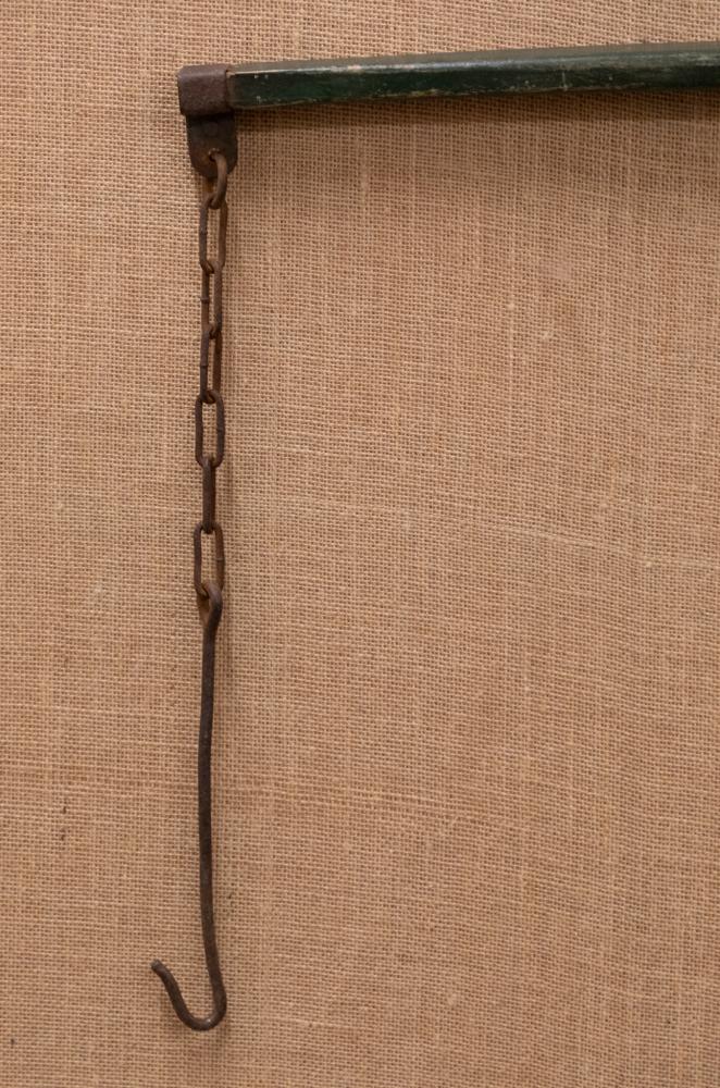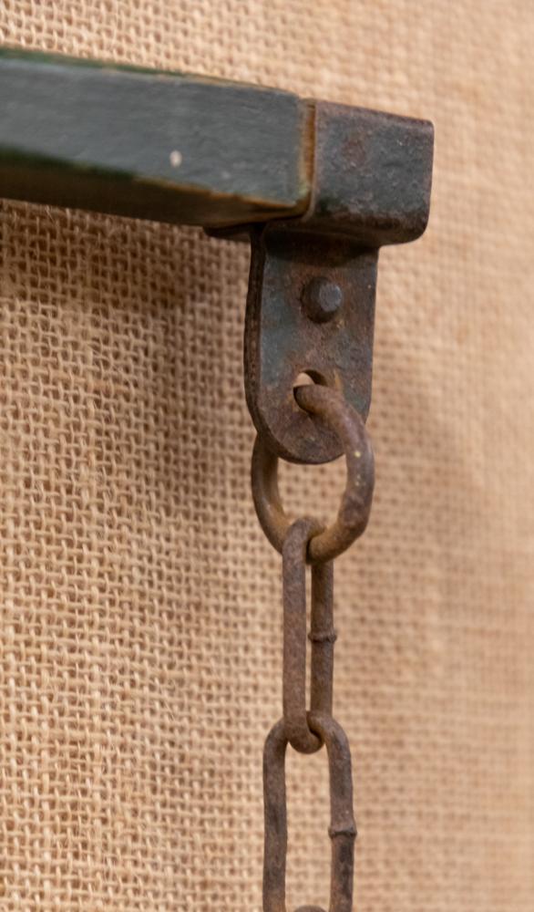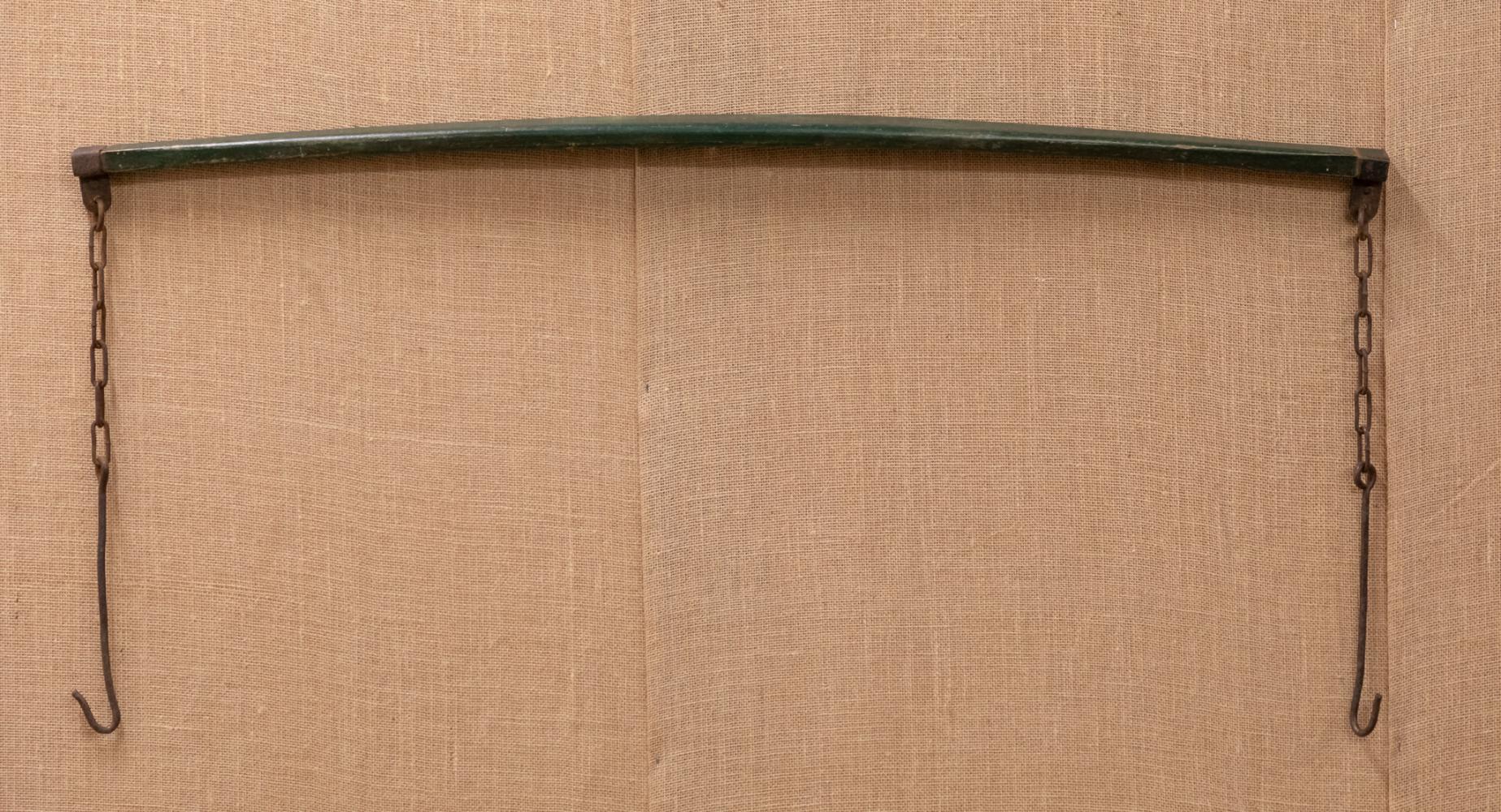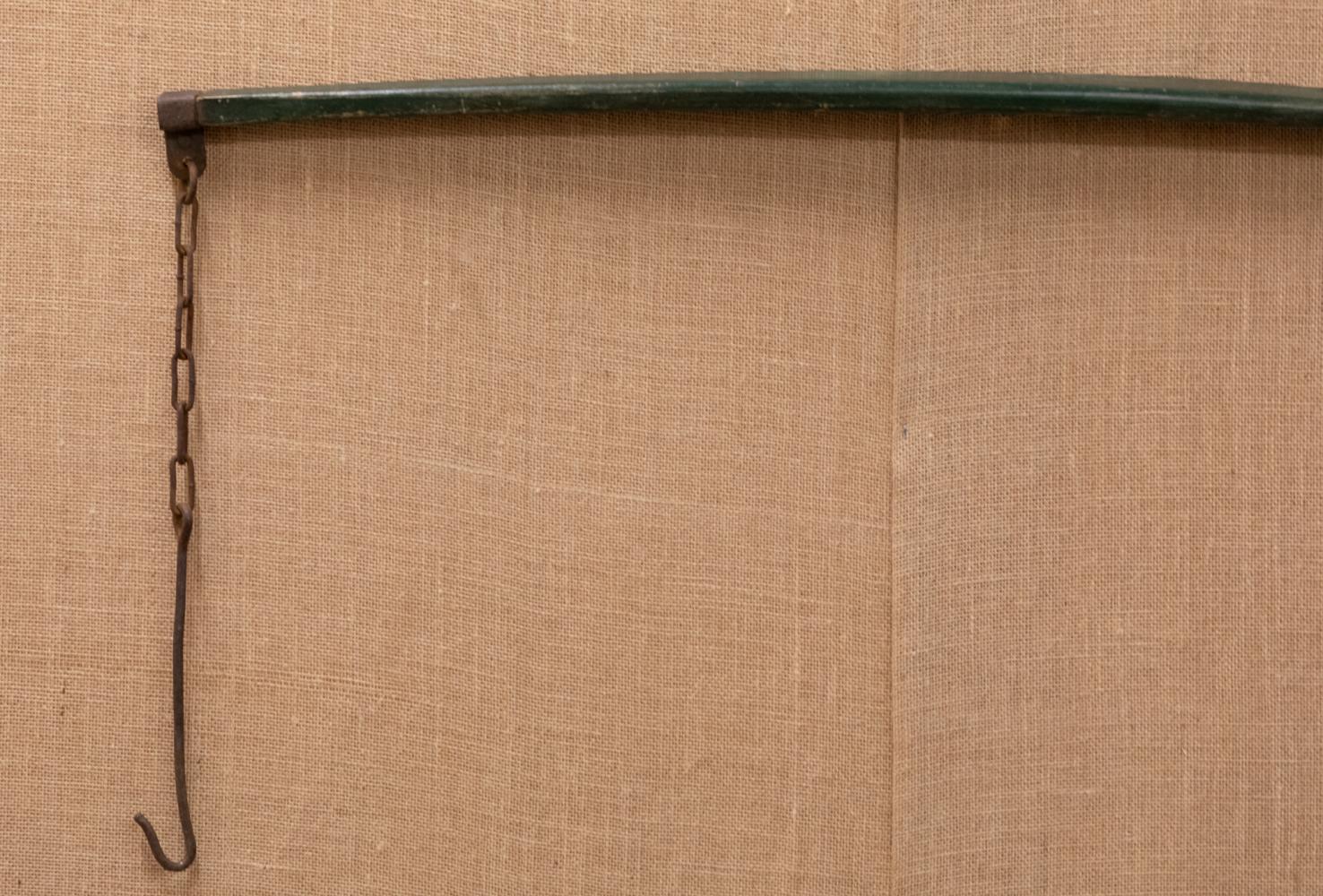 A fantastic early 19th century wooden yoke or carrier in the original green paint and retaining the original wrought iron hooks. Most recently used as a utensil hanger in a country kitchen.