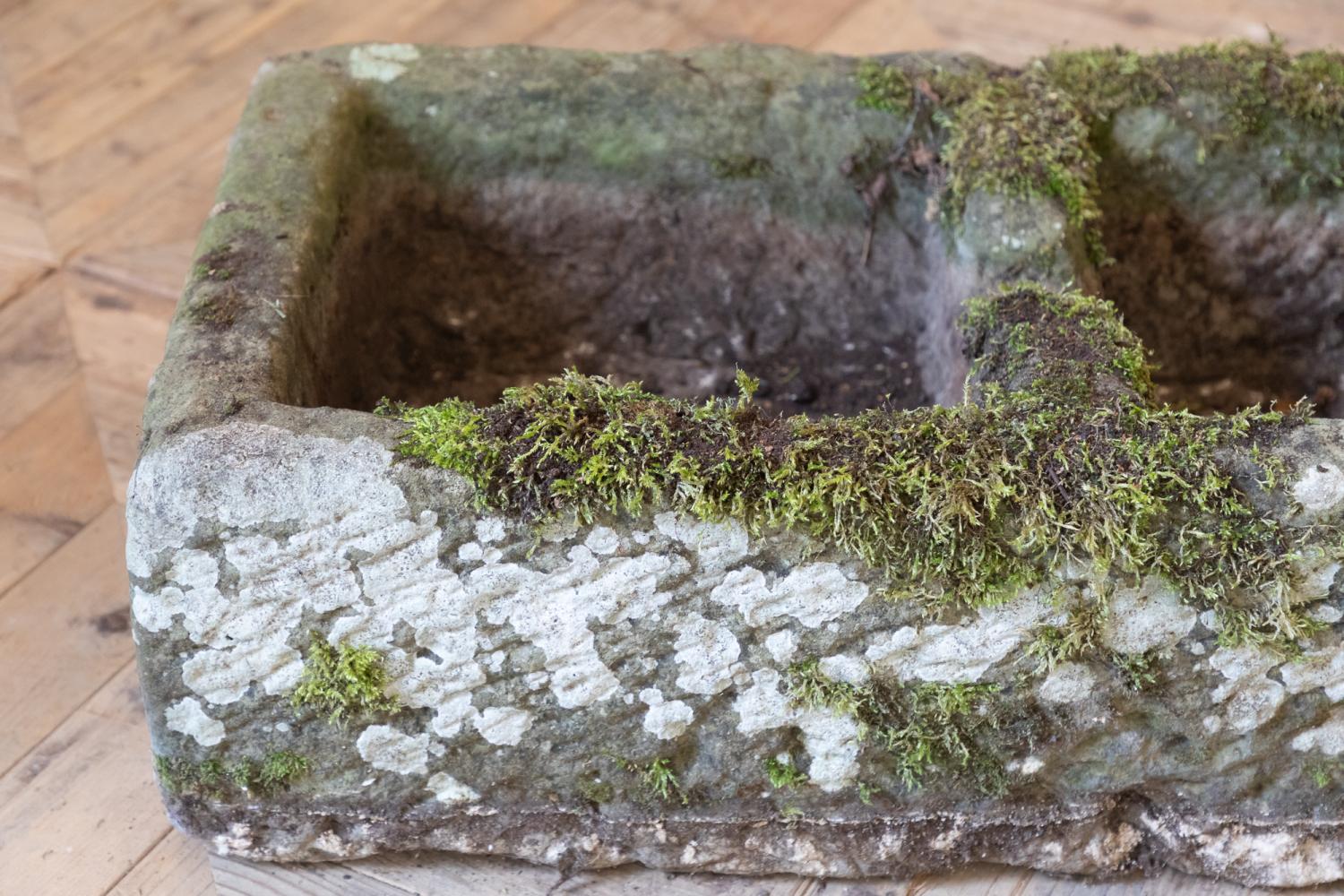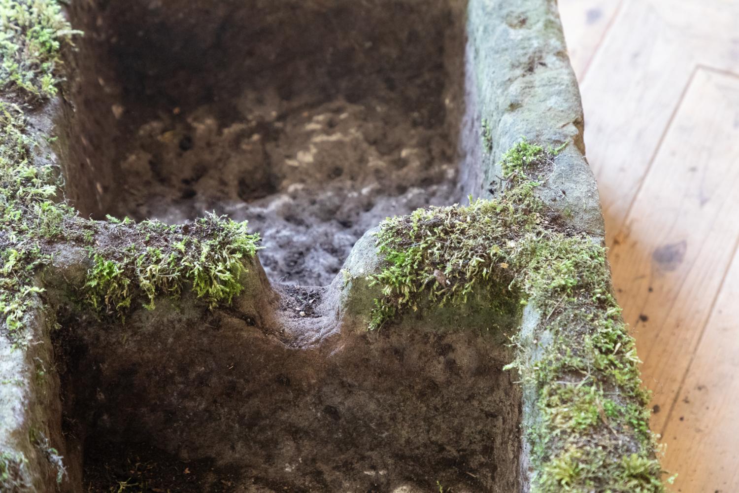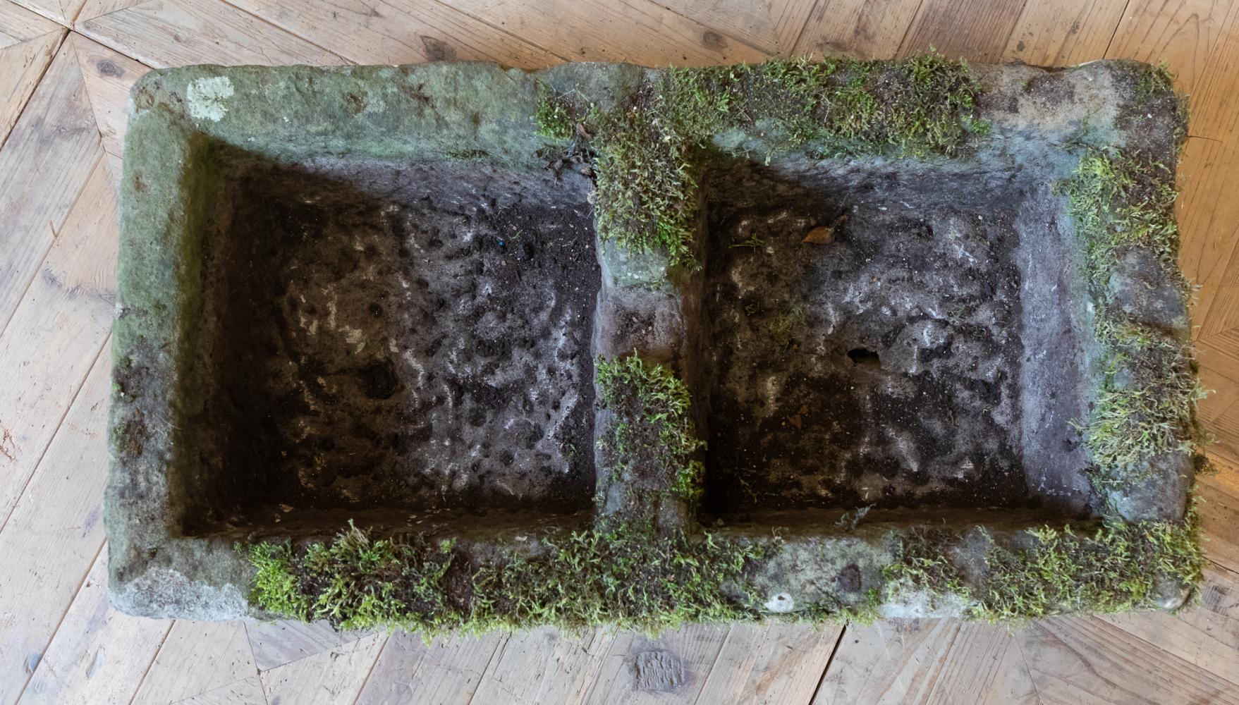 A large York Stone double sink or trough, with a wonderful carved overflow to the middle . Nicely weathered, moss covered with a great colour and patina.
