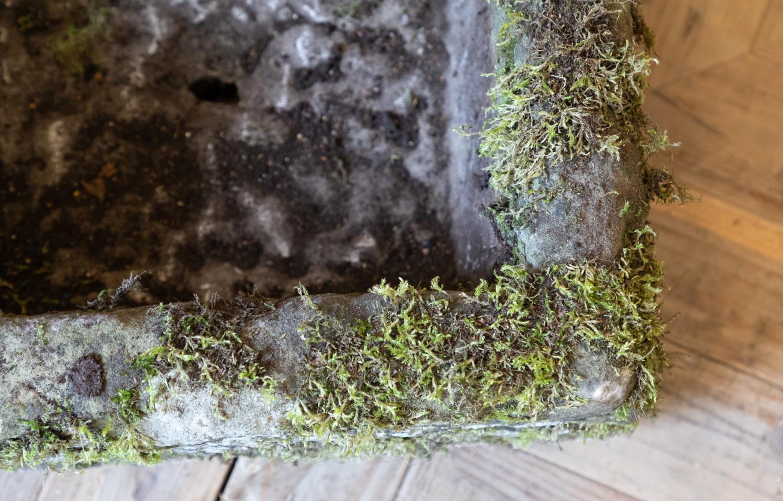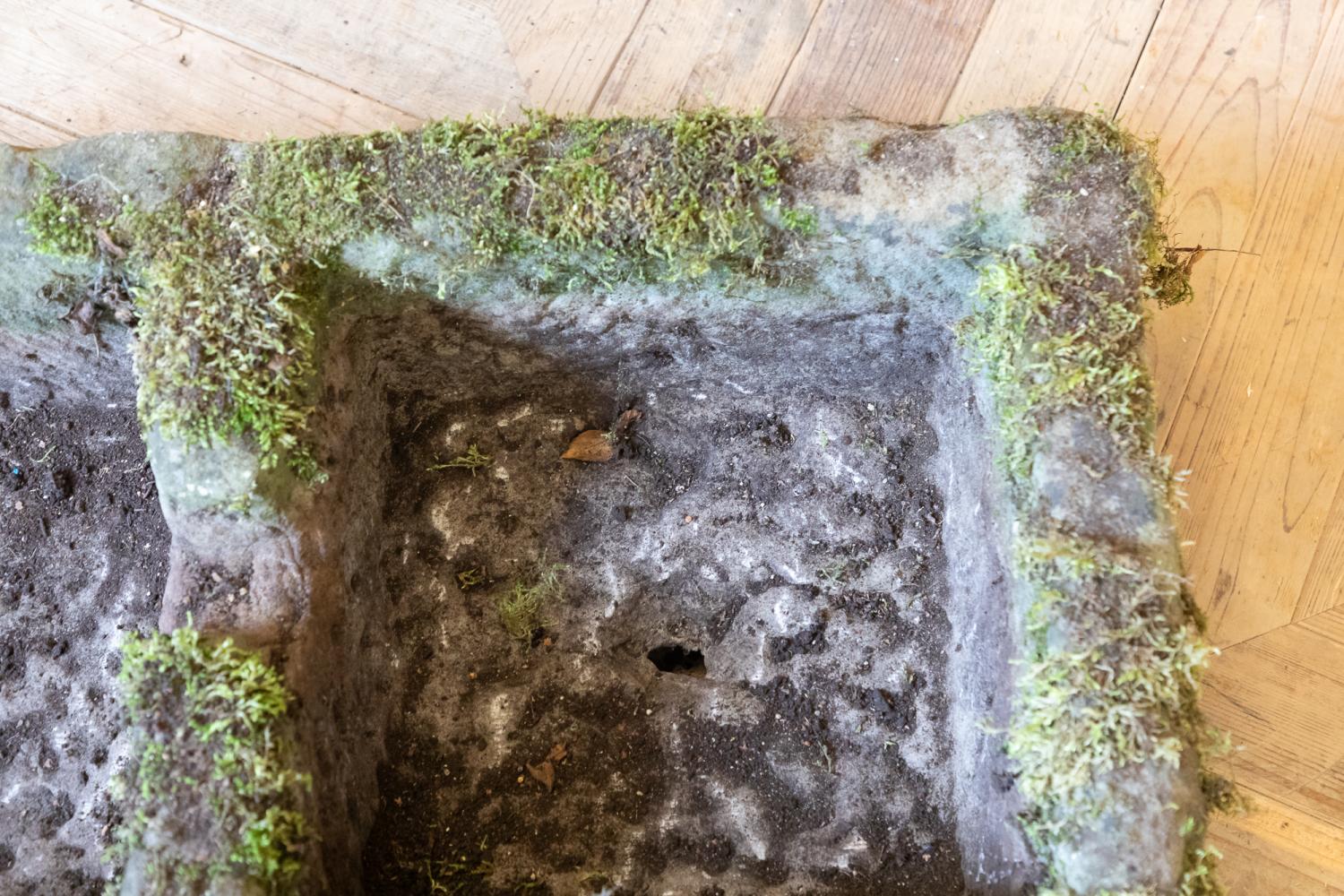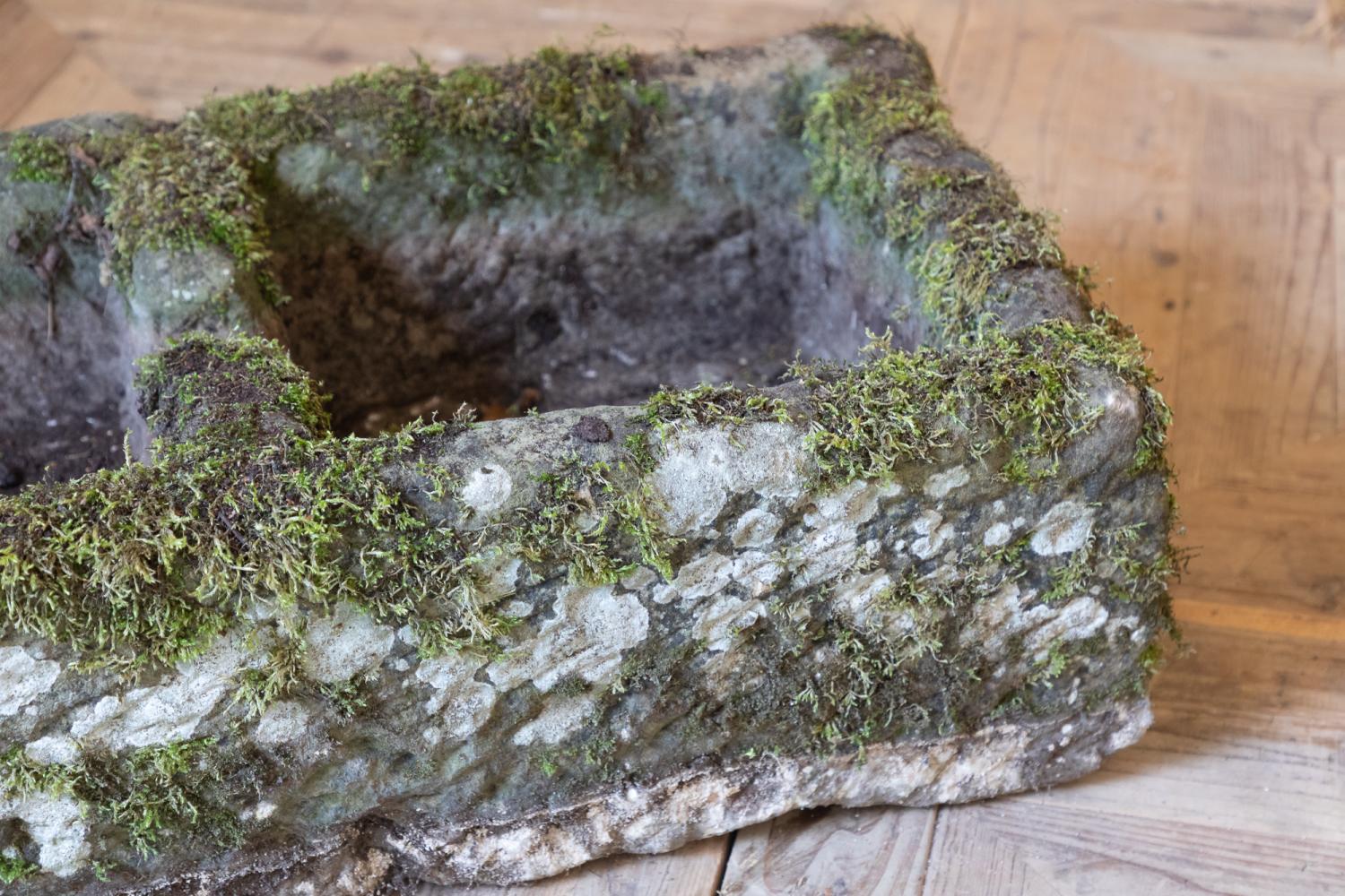 A large York Stone double sink or trough, with a wonderful carved overflow to the middle . Nicely weathered, moss covered with a great colour and patina.